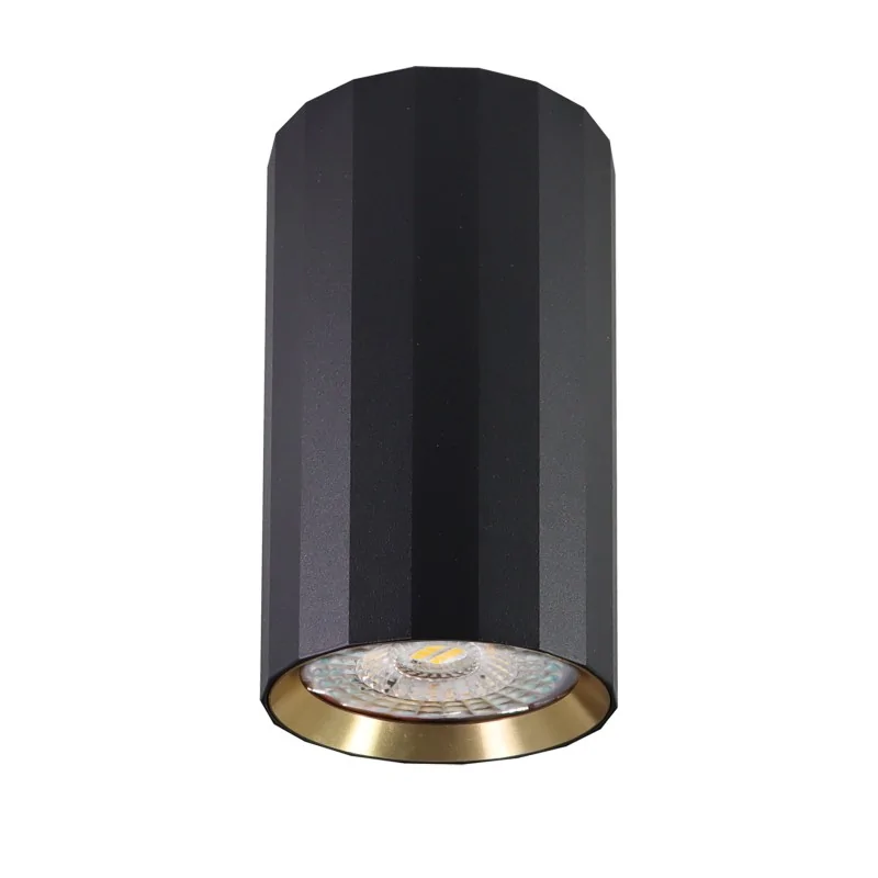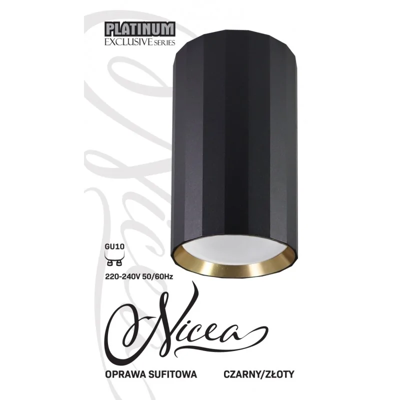 Sufitowa oprawa do montażu natynkowego NICEA to nowoczesna forma oświetlenia w kształcie tuby o średnicy 5,5cm. Obudowa w kolorze czarnym doskonale wkomponuje się w każdą aranżację wnętrza, a złoty spód doda jej charakteru. Prezentowana natynkowa tuba sufitowa sprzedawana jest bez źródła światła w zestawie, co pozwala na samodzielne dobranie żarówki do własnych potrzeb. Biała oprawa sufitowa przystosowana jest do współpracy z żarówką GU10 o maksymalnej mocy 10W led. Wymiary oprawy to 5,5x5,5x10cm. Tubka ze zdobioną powierzchnią wykonana jest z aluminium. IP20. Produkt dostępny także w wersji biało-złotej.