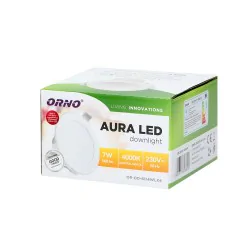 Oprawa sufitowa AURA, LED typu downlight z wbudowanym zasilaczem, przeznaczona do montażu podtynkowego w zabudowach typu karton-gips np. sufity podwieszane. Zastosowane w oprawie nowoczesne diody LED SMD gwarantują dużą energooszczędność i długą żywotność urządzenia. Oświetlenie sufitowe marki ORNO o neutralnej barwie światła, równej 4000K, pobiera zaledwie moc 7W. Oczko sufitowe wykonane zostało z materiału PMMA.