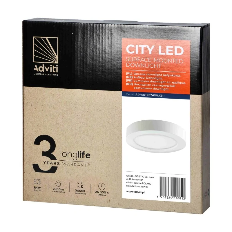 Okrągła oprawa sufitowa LED CITY typu downlight z wbudowanym zasilaczem, przeznaczona do montażu natynkowego w pomieszczeniach wewnętrznych takich jak: kuchnie, klatki schodowe, korytarze, piwnice, garaże itp. Zastosowane w oprawie nowoczesne diody LED SMD gwarantują dużą energooszczędność i długą żywotność urządzenia. Prezentowana lampa ścienno-sufitowa marki ORNO, działa z mocą 24W i emituje światło w ilości 1900 lm. Świeci światłem ciepłym o temperaturze 3000K. To typowe oświetlenie do pomieszczeń domowych, ponieważ jego barwa jest ciepła i przyjemna. Można przy niej poczytać, popracować, ale nie sprawia wrażenia światła biurowego. Produkt nadaje się zarówno do montażu na suficie jak i ścianie, a kompozycja kilku takich opraw stworzy ciekawy efekt wizualny np. w holu lub na klatce schodowej. Materiał: PMMA + aluminiowa wkładka.