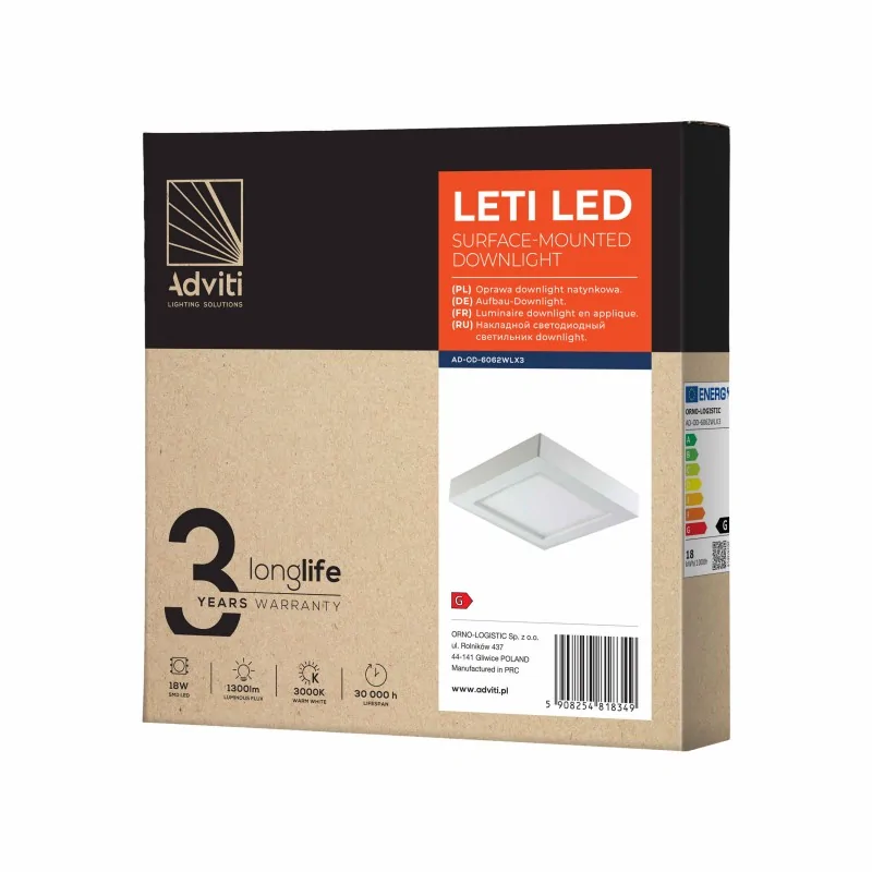 Kwadratowa oprawa sufitowa LED LETI typu downlight marki ORNO, z wbudowanym zasilaczem, przeznaczona do montażu natynkowego w pomieszczeniach wewnętrznych takich jak: kuchnie, klatki schodowe, korytarze, piwnice, garaże itp. Zastosowane w oprawie nowoczesne diody LED SMD gwarantują dużą energooszczędność i długą żywotność urządzenia. Prezentowana lampa ścienno-sufitowa działa z mocą 18W i emituje światło w ilości 1500 lm. Świeci światłem o ciepłej barwie i temperaturze 3000K. To typowe oświetlenie do pomieszczeń domowych, ponieważ jego barwa jest ciepła i przyjemna. Można przy niej poczytać, popracować, ale nie sprawia wrażenia światła biurowego. Produkt nadaje się zarówno do montażu na suficie jak i ścianie, a kompozycja kilku takich opraw stworzy ciekawy efekt wizualny np. w holu lub na klatce schodowej. Materiał: PMMA + aluminiowa wkładka.