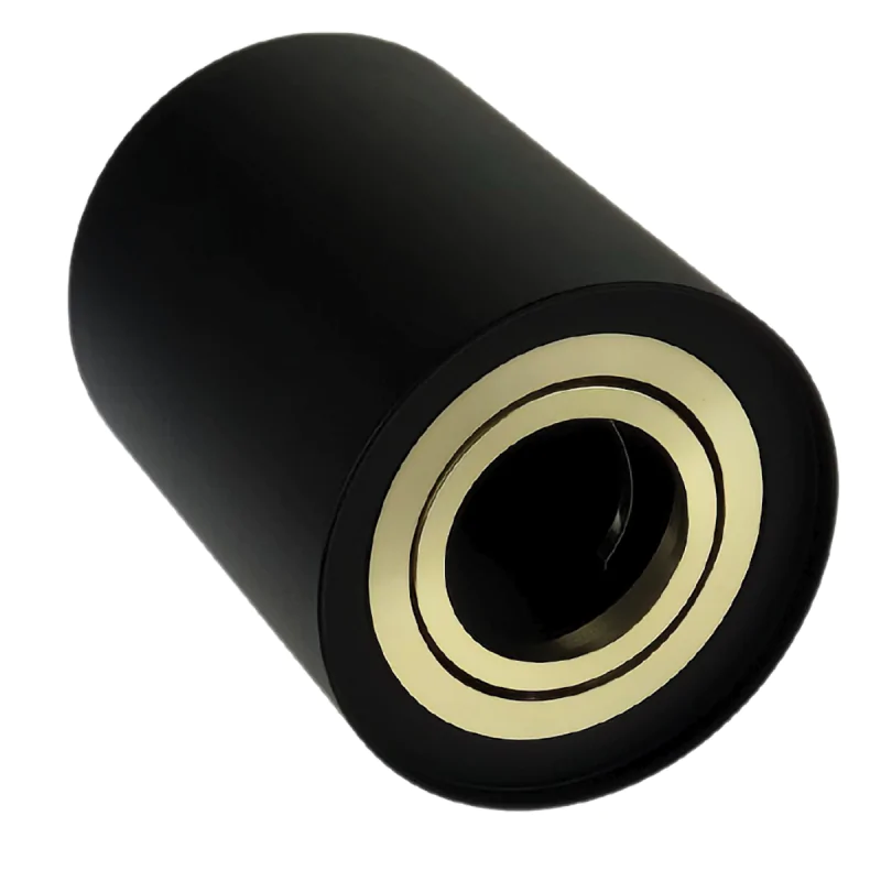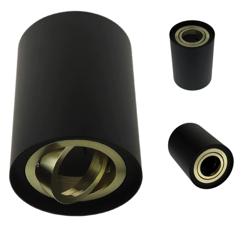 Nowoczesne oświetlenie sufitowa w formie czarnej tuby ze złotym akcentem