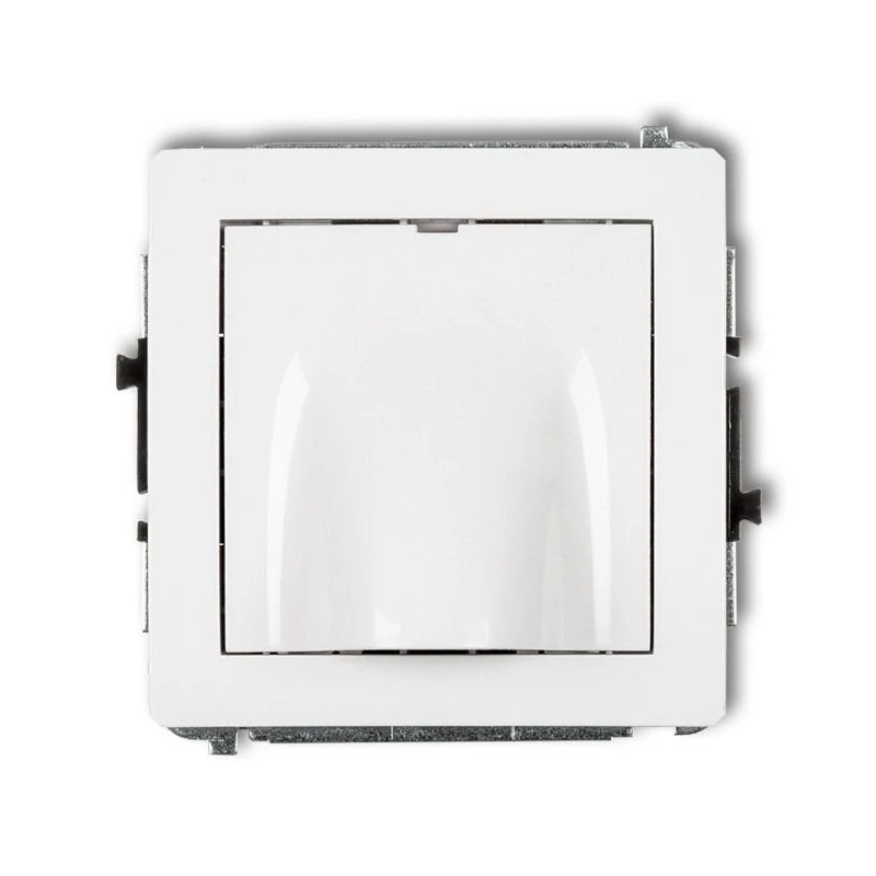 Mechanizm wypustu kablowego w kolorze białym serii DECO firmy KARLIK, przeznaczony do montażu podtynkowego. Wypust kablowy wymaga dokupienia ramki serii DECO firmy KARLIK.