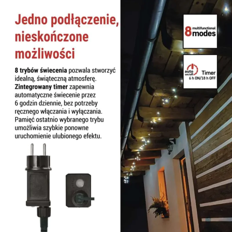 Długi łańcuch świetlny ułatwia tworzenie rozbudowanych kompozycji, dzięki czemu lampki świetnie prezentują się na dużych choinkach oraz większych powierzchniach dekoracyjnych. Wygodny timer automatyzuje codzienną obsługę, zapewniając komfort i bezpieczeństwo użytkowania.