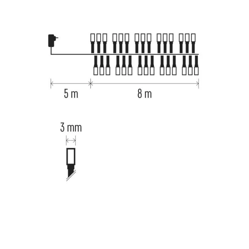 Klasyczne, multikolorowe lampki choinkowe D4BM02 typu jeżyk marki EMOS, to oczywisty wybór dla tworzenia przytulnej atmosfery przy różnych świątecznych okazjach. Światła są gęściej rozmieszczone na czarnym łańcuchu, dzięki czemu świecą intensywnie i tworzą niemal luksusowe wrażenie. Funkcja timera, po aktywacji której łańcuch powtarzalnie świeci przez 6 godzin, a następnie wyłącza się na 18 godzin. Łańcuchy jeżyki CLASSIC są odporne na wilgoć dzięki ochronie IP44 i nadają się do wszystkich dekoracji wewnętrznych i zewnętrznych. Prezentowane oświetlenie dekoracyjne, charakteryzuje się energooszczędnością i długą żywotności. 400 sztuk lampek LED o kolorowym świetle, pobierają moc 3,6W. Łańcuch choinkowy mierzy 8 metrów długości. Polecamy zapoznać się z cała rozbudowaną świąteczną serią marki EMOS.