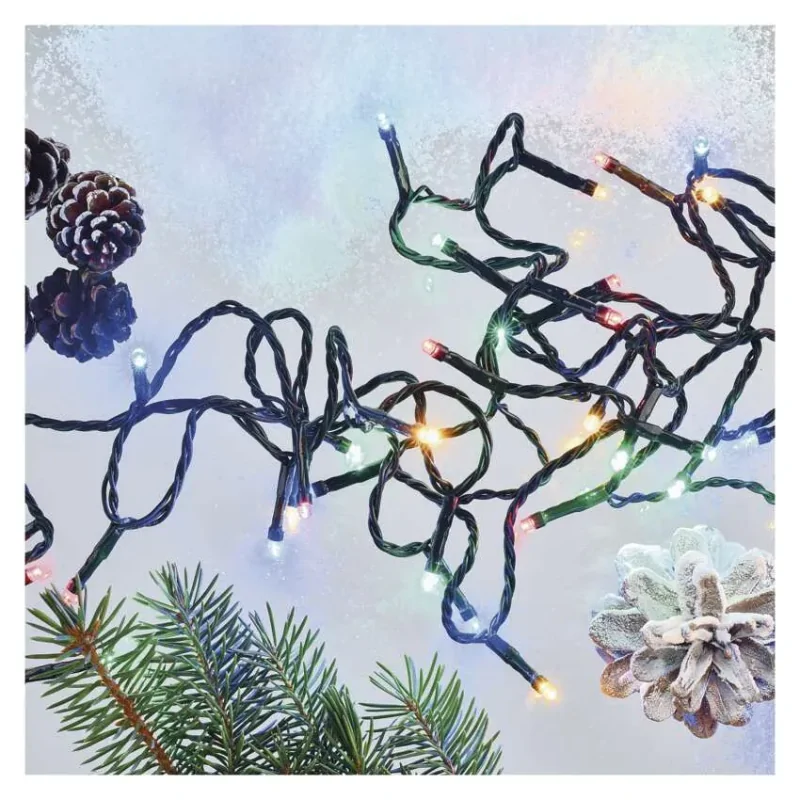 Multikolorowe lampki choinkowe D4AM01 producenta EMOS, to niezastąpiony element świąt Bożego narodzenia. Rozświetlą przestrzeń delikatnym ale efektownym światłem, tworząc nietuzinkowy klimat. Światełka dekoracyjne nadają się do zamontowania zarówno w pomieszczeniach, jak i na zewnątrz, dzięki wysokiemu stopniowi ochrony IP44. Zielony łańcuch o długości 4 metrów, wtopi się w drzewko, dzięki czemu jedynie będzie widocznych 40 sztuk wbudowanych diod LED o kolorowym świetle. Jest to energooszczędna propozycja dekoracyjna oświetleniowa, która świeci o mocy 3,6W. Funkcja timeru z pewnością Cię przekona, po aktywacji łańcuch powtarzalnie świeci przez 6 godzin, a następnie wyłącza się na 18 godzin. Polecamy zapoznać się z cała rozbudowaną świąteczną serią od marki EMOS.