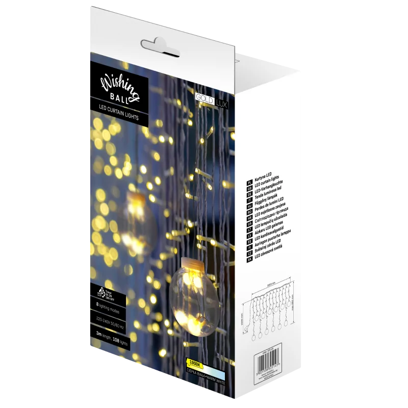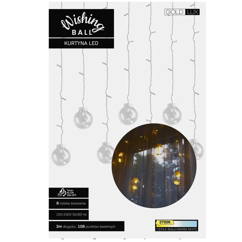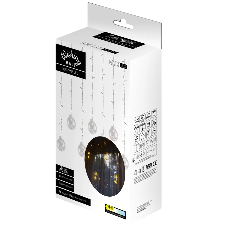 Kurtyna LED Wish Balls marki Pollux nie tylko wyczaruje nam bajkowy, przyjemny klimat, ale również nasze wnętrze oświetli ciepłą barwą światła 1900K o mocy 8W. Stanie się wyjątkową ozdobą wybranego pomieszczenia. Wyposażona w 8 funkcji oraz timer. Włącznik na zasilaczu jest zintegrowany ze sterownikiem. Kurtyna LED posiada stopień ochronności IP20, więc przeznaczona jest tylko wewnątrz budynku.