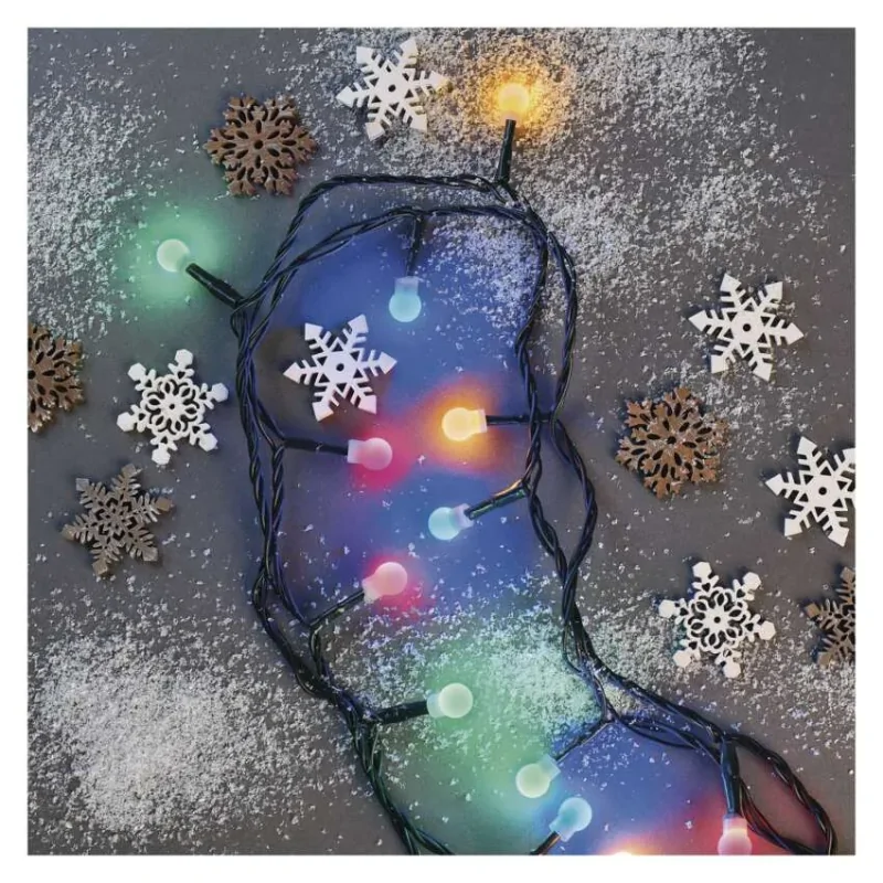Światełka choinkowe D5GM02 producenta EMOS, to oświetlenie o kolorowym świetle, które klimatycznie rozjaśni drzewko świąteczne. Forma kulek wprowadzi niezastąpiony klimat świąt i stworzy niepowtarzalny styl. Łańcuch choinkowy mierzy 5 metrów długości. Wbudowane diody LED w ilość 100 sztuk świecą multikolorowym światłem o mocy 6W. Przede wszystkim lampki na choinkę D5GM02 są energooszczędnym źródłem światła o długiej żywotności. Zielony przewód dopasuje się do odcienia choinki i stanie się niewidoczny. Światełka marki EMOS, dostępne są o różnej długości oraz barwie świecenia. Produkt objęty gwarancją producenta.