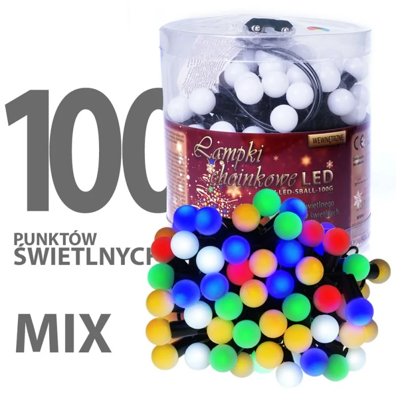 Lampki choinkowe CH/0108, posiadają 100szt mlecznych kuleczek, umieszczonych na 8m łańcuchu. Światełka wyposażone są w dodatkowe gniado, które umożliwia połączenie ze sobą do 5 kompletów. Dodatkowo jest to oszczędne oświetlenie, pobierające moc 6W. Prezentowana dekoracja świeci na kolorowo oraz posiada niewymienne źródło światła. Łańcuch marki RUM-LUX, przystosowany jest tylko do użytku w pomieszczeniu. Konstrukcja kompletu gwarantuje bezpieczne i długotrwałe użytkowanie. Produkt objęty jest gwarancją producenta.