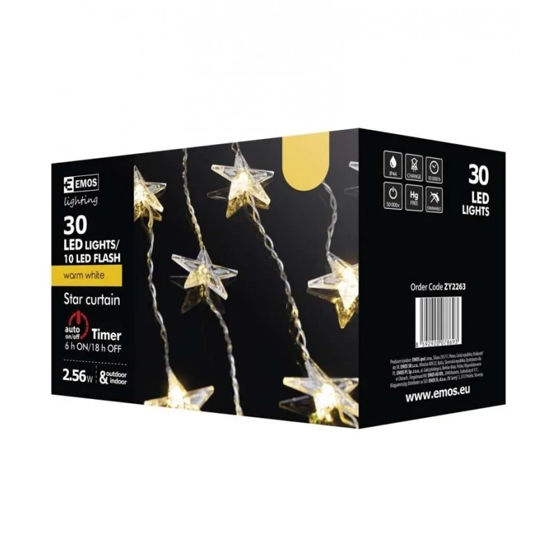Lampki świąteczne w postaci kurtyny migających gwiazdek marki EMOS to doskonała dekoracja świąteczna, która idealnie nada się na okno czy ścianę, dodając tym uroku w każdym wnętrzu. Prezentowana kurtyna świetlna emituje ciepłą barwą światła, co nada przyjemnego klimatu w wybranym pomieszczeniu. Dodatkowo światełka posiadają podwyższony stopień odporności IP44, dzięki czemu mogą być zastosowane zarówno wewnątrz, jak i na zewnątrz. Lampki wyposażone zostały również w funkcję timera, a ich szacowany czas żywotności to około 10000h.
