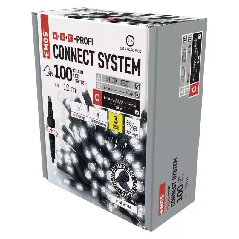 Światełka choinkowe D2AC03, wyposażone są w system łączenia PROFI, który umożliwia przedłużenie łańcucha, dlatego w zestawie nie ma zasilacza. Łańcuch wyposażony został w 100 sztuk diod led z zimnym światłem, które na zmianę świecą stale i migają. Dekoracyjne oświetlenie marki EMOS mierzy 10m długości i przystosowane zostało do użytku w pomieszczeniu oraz na zewnątrz (stopień ochronny to IP44). Żywotność diod LED jest szacowana na 10 000 godzin, materiał z jakich został wykonany to guma. Zastosowane diody led posiadają klasyczny kształt i są wielkości 7mm . Produkt objęty gwarancją producenta.