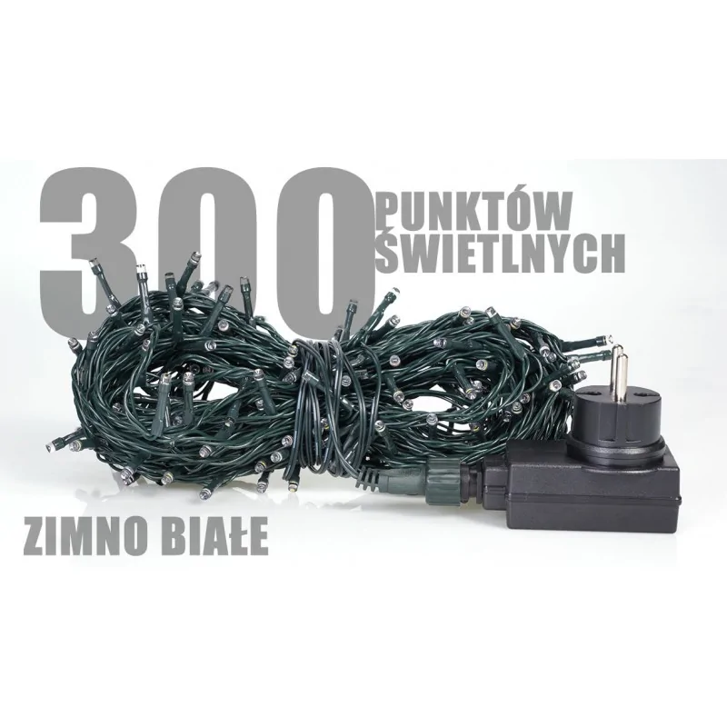 Lampki choinkowe CH/0143 zewnętrzne LED producenta RUM-LUX, 300 sztuk z programatorem, w sumie 31,5 m oświetlenia. Komplet jest bardzo oszczędny, 100 diodek to jedyne 3,8W poboru mocy. Przeznaczony jest do stosowania jako bezpieczne oświetlenie drzew, choinek, elewacji oraz innych konstrukcji znajdujących się zarówno wewnątrz, jak i na zewnątrz. Budowa lampek choinkowych gwarantuje bezpieczne i długotrwałe użytkowanie. W komplecie zastosowano mostkowe źródła światła, dzięki czemu przepalenie się jednego z punktów świetlnych pozwala na dalsze świecenie całego zestawu. Komplet wyposażony jest w programator, który pozwala na ustawienie 8 różnych funkcji migania, w tym funkcja stałego świecenia.