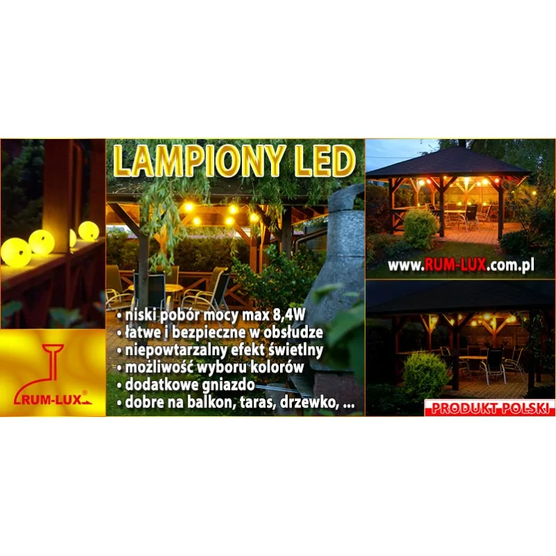 Lampki choinkowe LED marki Rum-Lux to kolorowe i wyjątkowe oświetlenie. Kule, które rozświetlą nam taras, balkon, choinkę stając się również ich ozdobą. Kule choinkowe LED posiadają podwyższony stopień ochronności IP44 odporne zatem będą na różne warunki pogodowe. Zaletą kompletu jest dodatkowe gniazdo, bo dzięki temu przyłączymy do 5-ciu zestawów. Światełka choinkowe LED wykonane zostały z dobrej jakości materiału. Produkt został objęty 2-letnią gwarancją producenta.