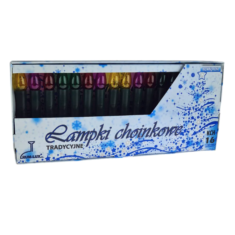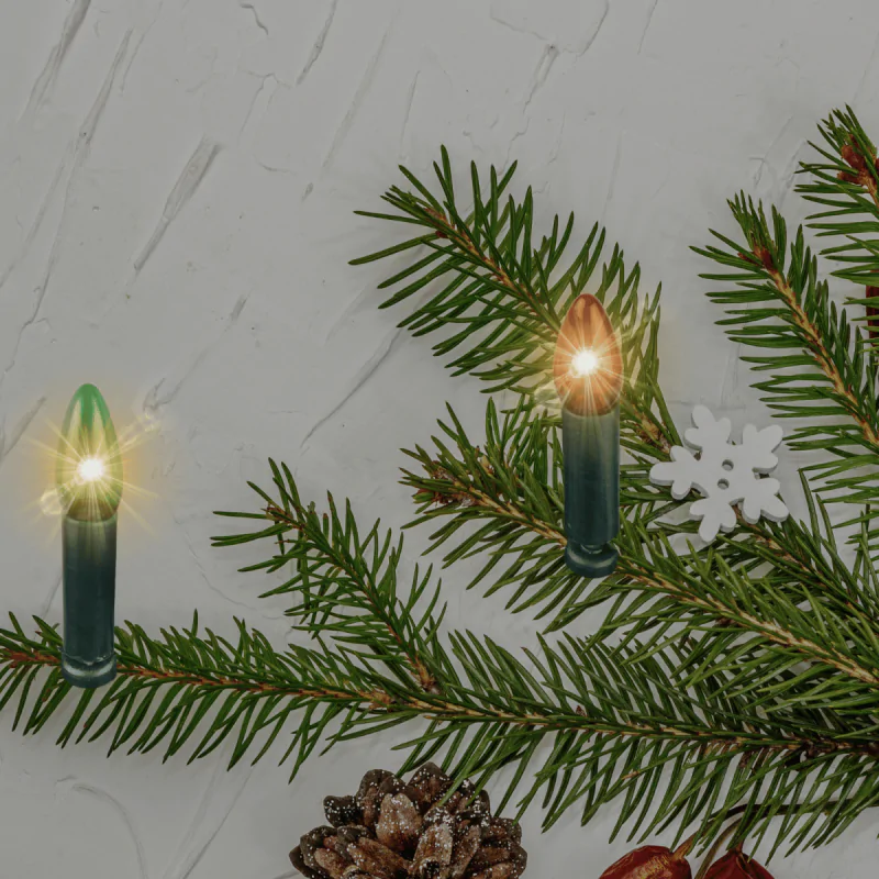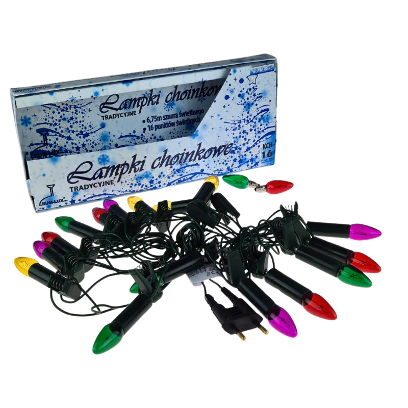 - Zestaw 16 kolorowych świeczek: Wielobarwne żarówki na zielonych podstawach tworzą ciepłą, świąteczną poświatę, idealnie komponującą się z tradycyjnymi ozdobami.