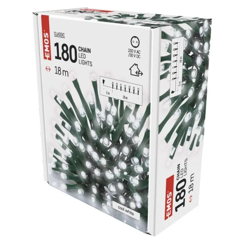 Łańcuchy choinkowy D4AC04 CLASSIC marki EMOS, standard od dawna jest bestsellerem w naszej ofercie i oferują szeroki zakres zastosowań nie tylko w tworzeniu świątecznych dekoracji i atmosfery. Funkcja timera, która po włączeniu powoduje, że łańcuch powtarzalnie świeci przez 6 godzin, a następnie wyłącza się na 18 godzin, zapewni bezpieczne użytkowanie. Światełka choinkowe są odporne na wilgoć dzięki ochronie IP44 i nadają się do wszystkich dekoracji wewnętrznych i zewnętrznych. Lampki na choinkę mierzą 18 metrów długości i mają 180szt wbudowanych diod LED. Światełka świecą zimną barwą światła, jest to energooszczędne oświetlenie, o mocy 3,6W. Do oświetlenia nie tylko choinki oferujemy szeroki wybór łańcuchów LED pod marką EMOS, które wyróżniają się niskim poborem mocy i długą żywotnością.
