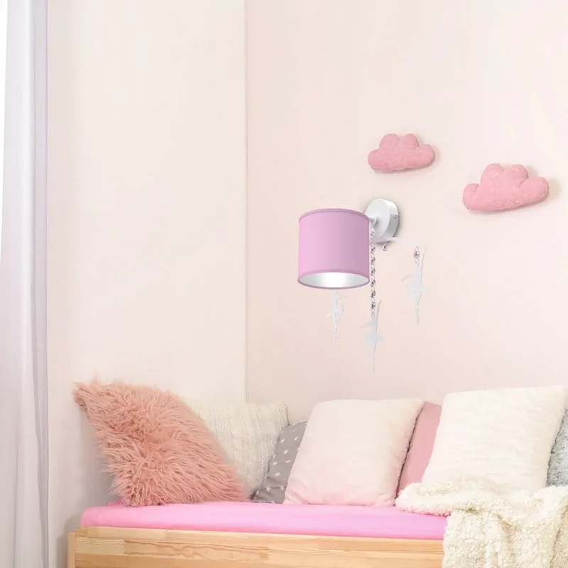 Wyjątkowy kinkiet BALETNICA MLP4971 marki EKO-LIGHT, szczególnie dedykowany jest do pokoi dziecięcych. Delikatne ozdoby w formie kryształków i baletnic, efektownie zwisają z podstawy, mieniąc się w blasku światła. Dopełnieniem jest uroczy różowy abażur wykonany z tkaniny. W prezentowanym oświetleniu należy zamontować żarówkę o gwincie E27 do maksymalnej mocy 60W. Ten model kinkietu może być zmiennikiem lampki nocnej, z pewnością jest to wygodniejsza alternatywa, która również nie zajmuje dużo miejsca. Wymiary lampy to 44cm wysokości oraz 38cm szerokość. Do kompletu polecamy wybrać lampy sufitowe.