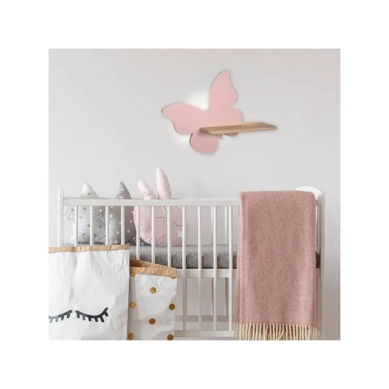 Funkcjonalny kinkiet motylek posiada półkę podświetlaną, zintegrowanym LED-em. Jest to idealny produkt, który nada się do zawieszenia obok łóżeczka dziecięcego. Całość wykonana jest z solidnych materiałów - z drewna, płyty MDF oraz stali. Delikatne pastelowo-różowe połączenie z drewnem sprawia, że wnosi do pomieszczenia przyjemny i bezpieczny klimat. Zastosowanie źródła światła LED gwarantuje energooszczędność. Lampa ścienna marki Candellux działa z mocą 5W świecąc neutralną barwą światła na poziomie 205 lm. Wymiary oświetlenia wynoszą: szerokość - 40 cm oraz wysokość - 29,5cm. W zestawie przewód z wtyczką i włącznikiem.