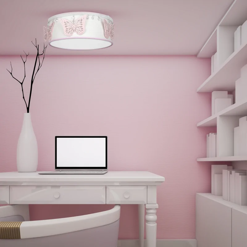 Okrągła lampa sufitowa PAPILLON MLP8283 producent EKO-LIGHT, ozdobiona jest wyjątkowymi elementami w postaci różowych motylków oraz delikatnie zwisających kryształków. Całość zamontowana została na białym kloszy wykonanym z tworzywa i usztywnionym metalowymi elementami. Oświetlenie mierzy 13cm wysokości, natomiast średnica wynosi 40cm. Jest to propozycja do pokoju dziecięcego ale także do sypialni czy salonu urządzonym w nieco delikatniejszym stylu. Plafon posiada miejsce na dwie oprawki o trzonku E27, możemy zamontować energooszczędne żarówki LED. Lampa dostępna jest w formie wiszącej oraz z różnymi elementami dekoracyjnymi.