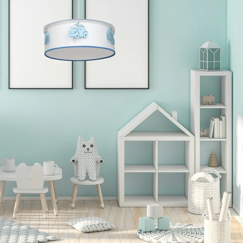 Wyjątkowa lampa wisząca AUTOMOBILE MLP8284 marki EKO-LIGHT, dedykowana jest szczególnie do pokoju dziecięcego, ponieważ ma drewniane elementy w kształcie niebieskich samochodzików. Abażur wykonany z tworzywa jest delikatny i przyjemny w dotyku. Światło dzięki białej powierzchni oprawy oraz różnicom w przepuszczalności jest wyjątkowo przytulne, niezależnie od tego, w jakim miejscu się znajdzie. Oświetlenie przystosowane jest na tradycyjną żarówkę o trzonku E27 (brak w zestawie). Średnica klosza wynosi 35cm, natomiast wysokość mierzy 90cm, jednak jest możliwość jej skrócenia do 40cm. Ten model dostępny jest również w formie plafonu.