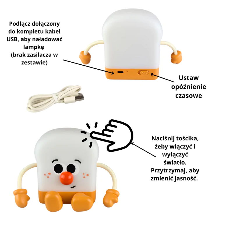 Bezpieczna i lekka konstrukcja z miękkiego silikonu sprawia, że Tościk jest w pełni bezpieczny nawet dla najmłodszych użytkowników, a port USB umożliwia wygodne ładowanie lampki w dowolnym miejscu. Jest to nie tylko praktyczny element wyposażenia, ale również stylowa dekoracja do pokoju dziecięcego lub sypialni. Dzięki funkcji timera 30/60 minut, lampka nocna automatycznie wyłącza się po określonym czasie, co zapewnia komfort snu Twojemu dziecku.