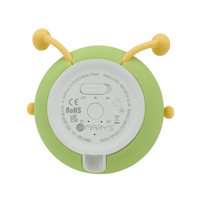 Lampka nocna jest wykonana z trwałych i bezpiecznych materiałów, takich jak ABS, PC i silikon. Miękka zielona powłoka silikonowa zapewnia dodatkową ochronę, dzięki czemu lampka jest całkowicie bezpieczna w użytkowaniu przez dzieci. Odporność na uszkodzenia oraz łatwość czyszczenia sprawiają, że lampka zachowa swój wygląd przez długi czas.