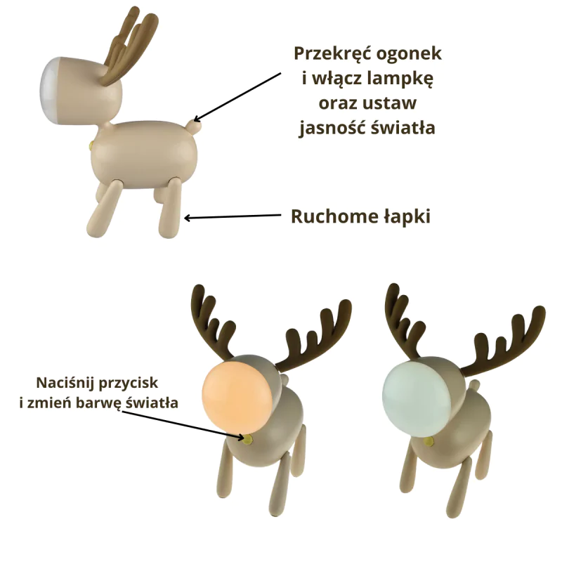 - Intuicyjne sterowanie dotykowe: Łatwa zmiana jasności i barwy za pomocą dotyku na tułowiu i ogonie jelonka.