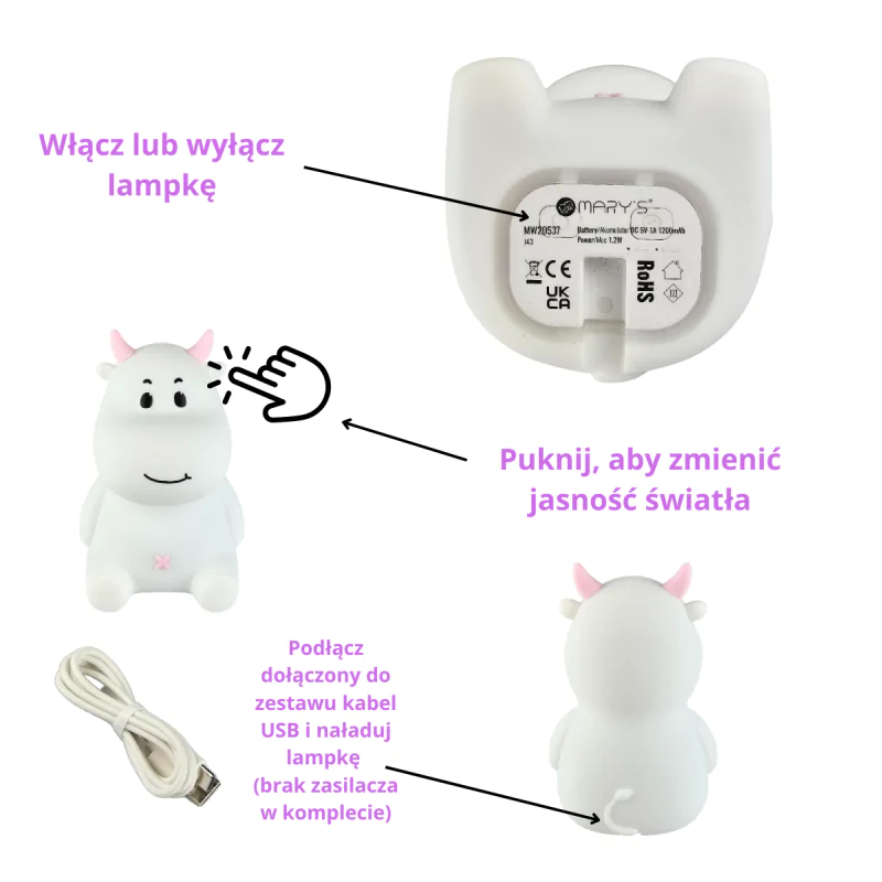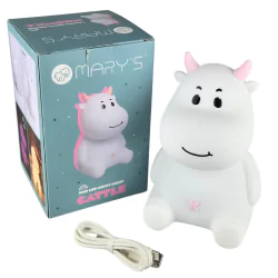 Lampka Nocna LED Krówka Mary's to doskonałe rozwiązanie dla każdego, kto szuka połączenia uroczego designu z praktycznym oświetleniem do pokoju dziecięcego. Lampka w kształcie krówki z subtelnymi różowymi detalami idealnie pasuje na biurko malucha, tworząc ciepłą, przyjazną atmosferę, która sprzyja wyciszeniu i spokojnemu zasypianiu. Dzięki delikatnemu światłu w barwie ciepłej bieli, doskonale nadaje się do wieczornego czytania bajek czy jako subtelne światło nocne.
