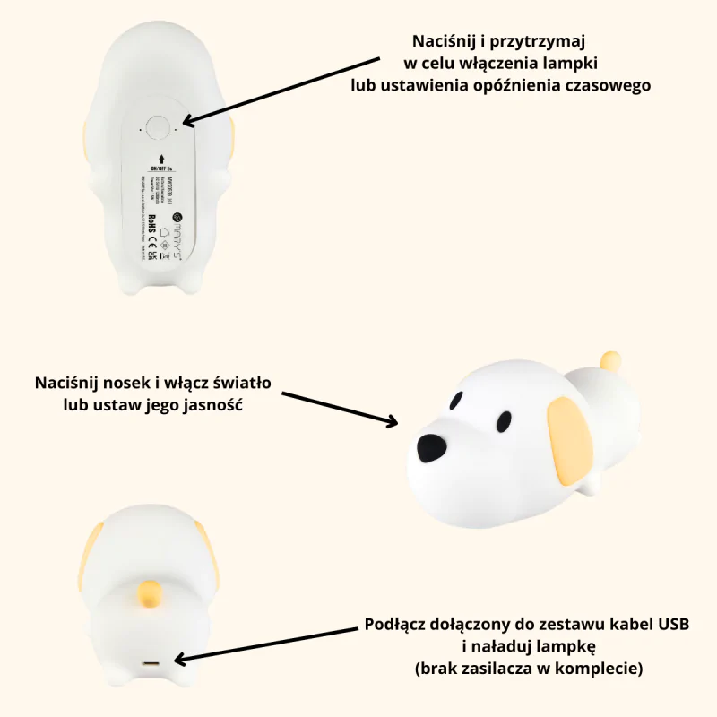 Lampka nocna LED dla dzieci w kształcie uroczego pieska serii MARY'S to doskonały wybór dla tych, którzy cenią funkcjonalność połączoną z estetyką. Zaprojektowana z myślą o najmłodszych użytkownikach, a także dorosłych miłośnikach zwierząt, przyciąga uwagę swoim przyjaznym wyglądem i ciepłym światłem.