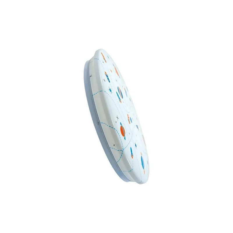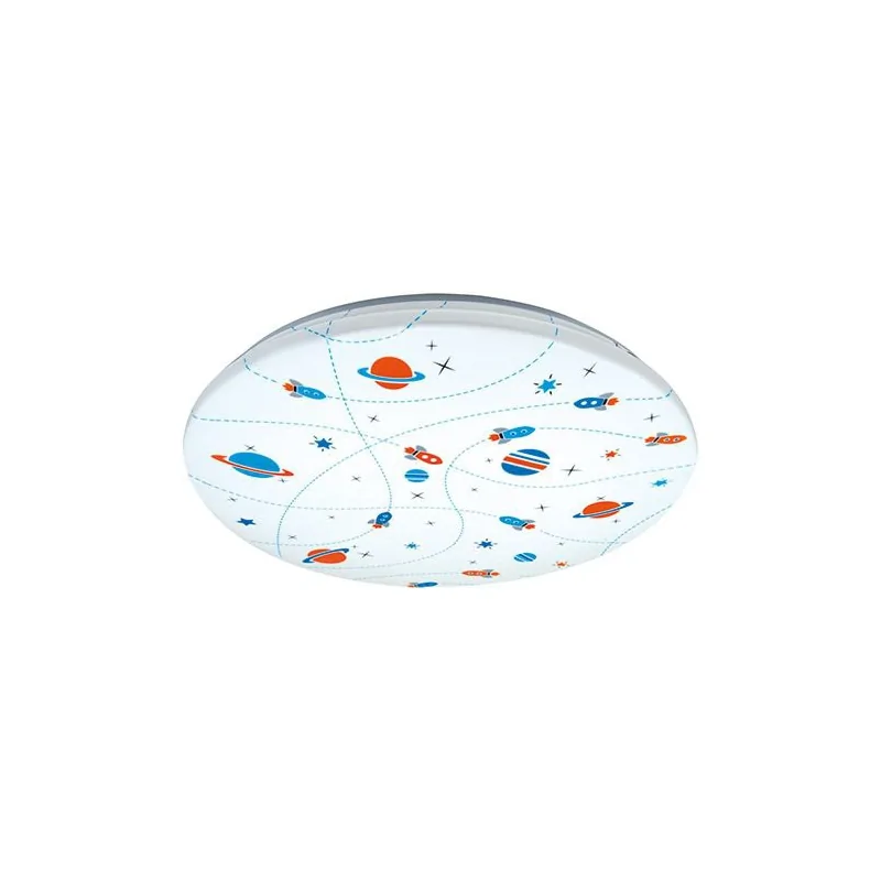 Plafon sufitowy marki Ideus to okrągła lampa sufitowa w kolorze białym wzbogacona o kolorowe akcenty kosmiczne. Plafoniera w dość dużych rozmiarach (70 x 385 x 385 mm) charakteryzuje się bardzo długą żywotnością sięgającą 30000 godzin. Proponowana lampa plafon świeci naturalnym, białym światłem 4000K o mocy strumienia świetlnego 1800 lumenów. Jest przyjazna dla wzroku przez co sprzyja koncentracji. W jej towarzystwie nauka staje się przyjemniejsza i co najważniejsze bardziej efektywna. Plafoniera doskonale sprawdzi się w pokoju dziecięcym nie tylko ze względu na znakomite parametry ale również ciekawą estetykę wykonania.