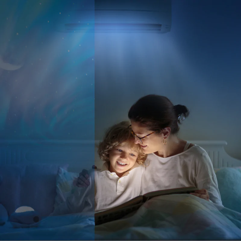 - Projekcja kosmiczna RGBW – Tworzy wyjątkowy efekt galaktyczny dzięki różnorodnym kolorom (niebieski, zielony, czerwony, biały) i melodii idealnym do relaksacji i dekoracji wnętrza.