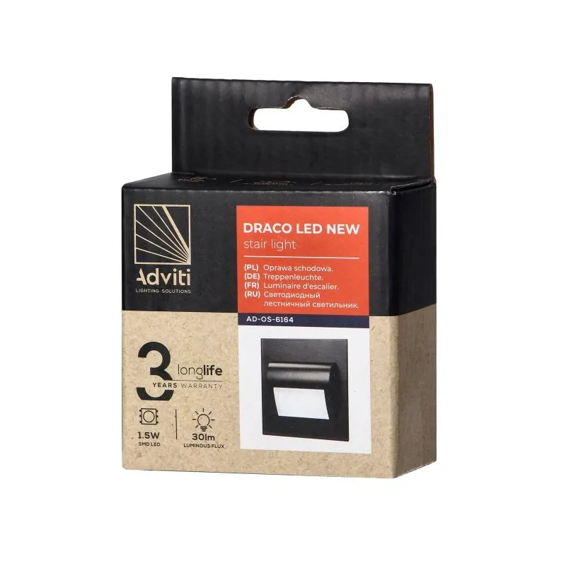 Schodowa oprawa z kolekcji DRACO LED marki ORNO, przeznaczona jest do dekoracyjnego oświetlania pojedynczych stopni, korytarzy, ścian, elewacji lub ciągów komunikacyjnych wewnątrz pomieszczeń. Oryginalny design i wykonanie z najwyższej jakości stali szlachetnej w połączeniu z innowacyjną technologią LED sprawia, że oprawa znajdzie zastosowanie we wnętrzach zarówno klasycznych jak i nowoczesnych. Ta lampka schodowa działa z mocą 1,5W i emituje światło w ilości 30 lm, o ciepłej i przyjemnej barwie, która wynosi 3000K. Innowacyjna metoda montażu pozwala zamontować oprawę w każdej puszcze o średnicy 60mm. Polecamy zapoznać się z rozbudowaną serią DRACO.