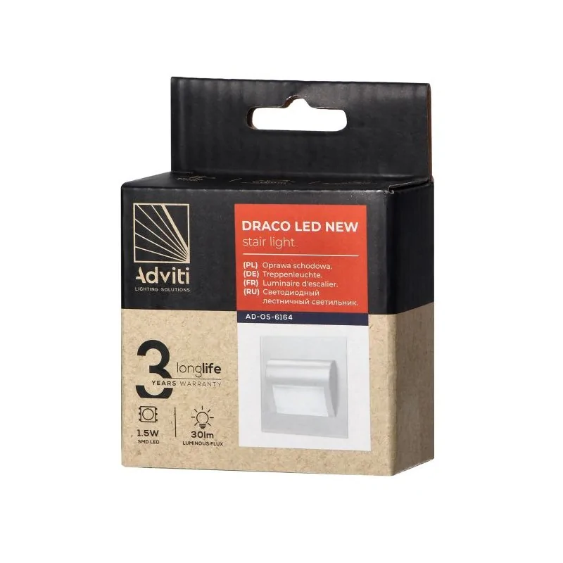 Schodowa oprawa z kolekcji DRACO LED marki ORNO, przeznaczona jest do dekoracyjnego oświetlania pojedynczych stopni, korytarzy, ścian, elewacji lub ciągów komunikacyjnych wewnątrz pomieszczeń. Oryginalny design i wykonanie z najwyższej jakości stali szlachetnej w połączeniu z innowacyjną technologią LED sprawia, że oprawa znajdzie zastosowanie we wnętrzach zarówno klasycznych jak i nowoczesnych. Ta lampka schodowa działa z mocą 1,5W i emituje światło w ilości 30 lm. Oświetlenie świeci neutralną barwą światłą, równą 4000K. która jest najbardziej zbliżona do światła dziennego. Innowacyjna metoda montażu pozwala zamontować oprawę w każdej puszcze o średnicy 60mm. Polecamy zapoznać się z rozbudowaną serią DRACO.