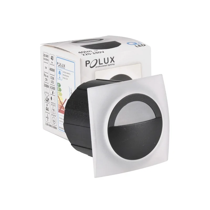 Oprawa podtynkowa do podświetlnia schodów firmy POLUX posiada wbudowane źródło światła SMD LED emitujące neutralne białe światło o temperaturze 4000K z mocą strumienia świetlnego o wartości 40 lumenów. Zastosowane oświetlenie należy do wysokiej klasy energetycznej od A do A++. Niewielka jasność oświetlenia (moc 3W) zapewnia bezpieczny efekt doświetlenia korytarzy, schodów czy innych ciągów komunikacyjnych. Podtynkowe oświetlenie schodowe 230V charakteryzuje się bardzo długą żywotnością do 25 000h. Produkt dostępny jest również w innych wersjach. Oprawa schodowa led posiada 2 letnią gwarancję. Aluminiowe oprawy przeznaczone są do montażu ściennego , dzięki podwyższonej ochronie - IP44 odporne są na wnikanie wilgoci i kurzu.