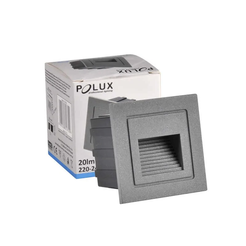 Kwadratowa oprawa schodowa led Q6 firmy Polux przeznaczona została do montażu podtynkowego i jest w kolorze grafitowym. Zastosowana w niej technologia led zapewnia znaczną oszczędność energii (nawet 80%). Prezentowana lampa schodowa posiada aluminiową obudowę o wysokim stopniu odporności na wnikanie pyłu i wilgoci (IP65). Oprawa wyposażona została w zintegrowane, niewymienne źródło światła LED, którego przybliżony czas działania to około 25000h oraz 12500 cykli on/off. Produkt emituje neutralną barwą światła o temperaturze barwowej 4000K i strumieniu świetlnym równym 20 lumenów.