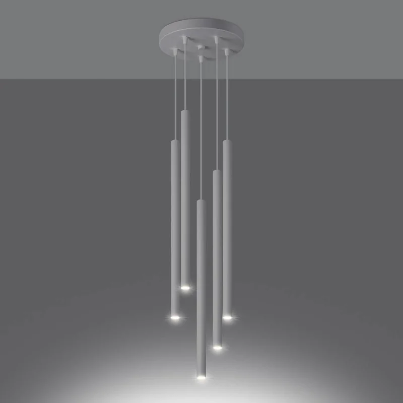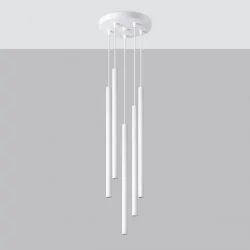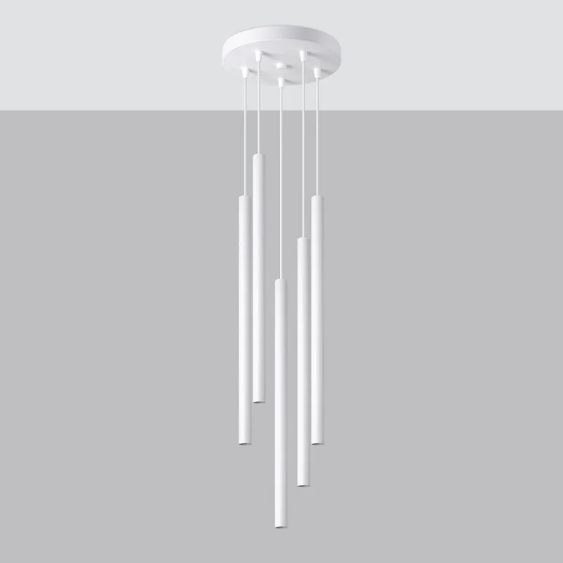Biała lampa wisząca Pastelo marki Sollux lighting to minimalistyczne i wyjątkowe oświetlenie w kształcie wiszących, długich, wąskich tub. Piękna ozdoba w niejednym naszym wnętrzu. Lampa sufitowa posiada regulowane zawiesie, więc długość jej dobierzemy do własnych potrzeb. Dzięki wymiennym źródłom światła o gwincie G9 dobierzemy odpowiednią do naszych oczekiwań barwę światła oraz maksymalną moc 5x8W. Pamiętajmy, że żarówki nie znajdują się w zestawie. Oświetlenie sufitowe Pastelo dostępne jest z 1, 3 lub 5 źródłami światła o różnych ułożeniach oraz w różnych materiałach i kolorach. Lampa wisząca wykonana została z dobrej jakości materiału, a utrzymanie jej w czystości jest wyjątkowo łatwe. Polski produkt objęty 5-letnią gwarancją producenta.