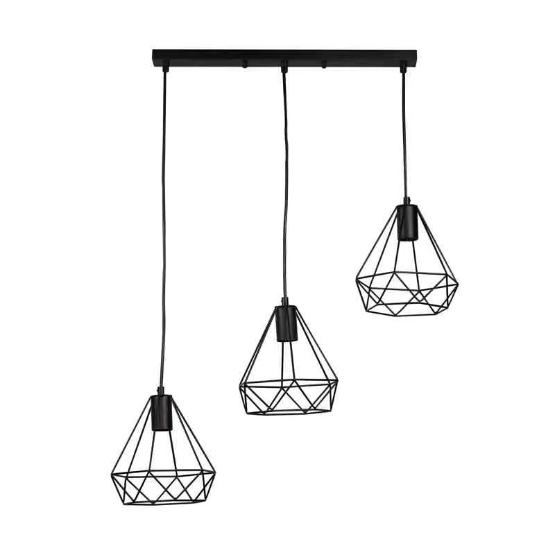 Geometryczna lampa wisząca .VIGO P POLUX w kolorze czarnym to hitowe oświetlenie z 3 drucianymi kloszami umieszczonymi na listwie o długości 60cm. Oprawa w połączeniu z ciekawymi ozdobnymi żarówkami dekoracyjnymi prezentuje się niezwykle efektownie. Oprawa sprzedawana jest bez źródła światła. Do metalowej czarnej lampy loftowej pasują żarówki z gwintem E27 o mocy do max 20W LED. Lampa w nowoczesnym loftowym stylu posiada 24 miesięczną gwarancję. Prezentowana oprawa świetnie sprawdzi się w surowo urządzonych salonach czy jako oświetlenie pubu, restauracji czy hotelu. W rodzinie produktów VIGO dostępna jest również oprawa na 3 źródła światła w wersji na kole oraz w wersji pojedynczej oraz w wersji z drewnianymi wstawkami.