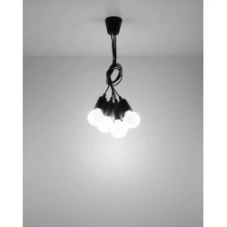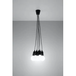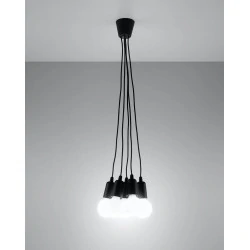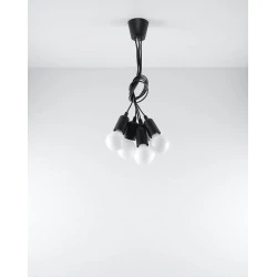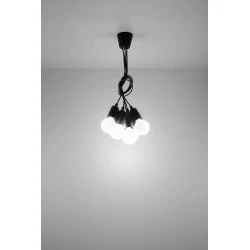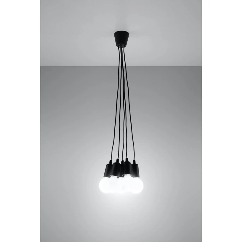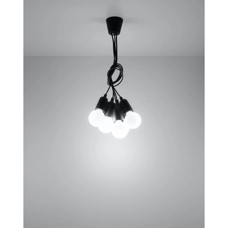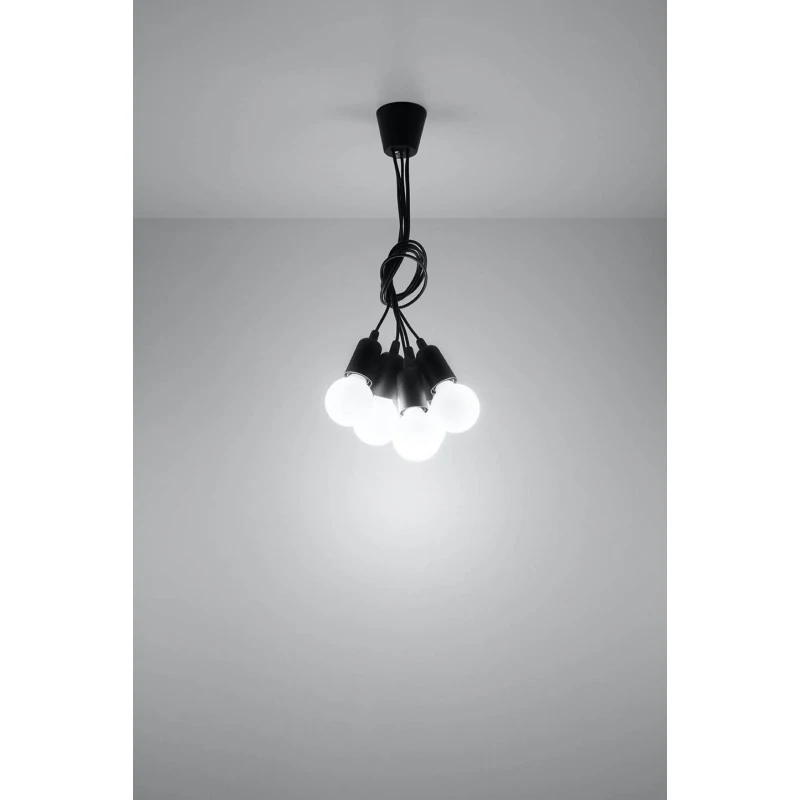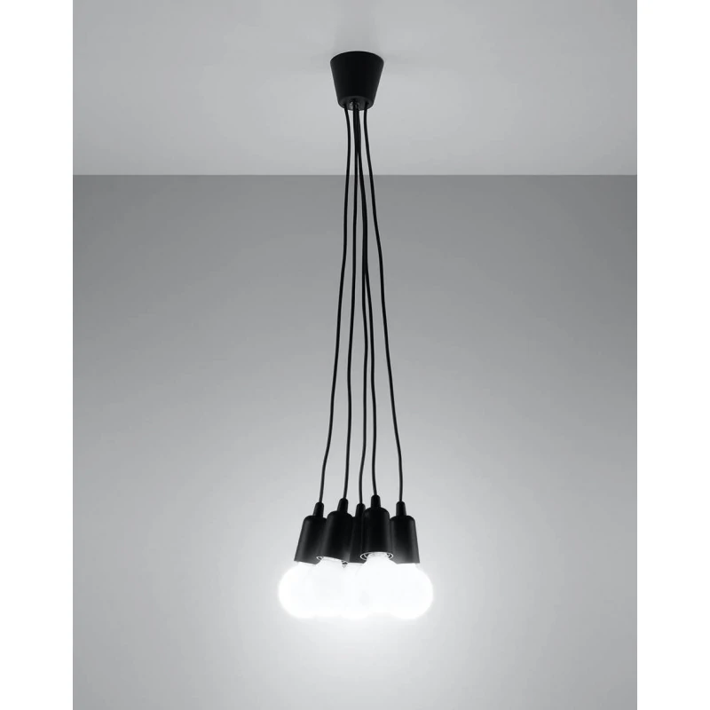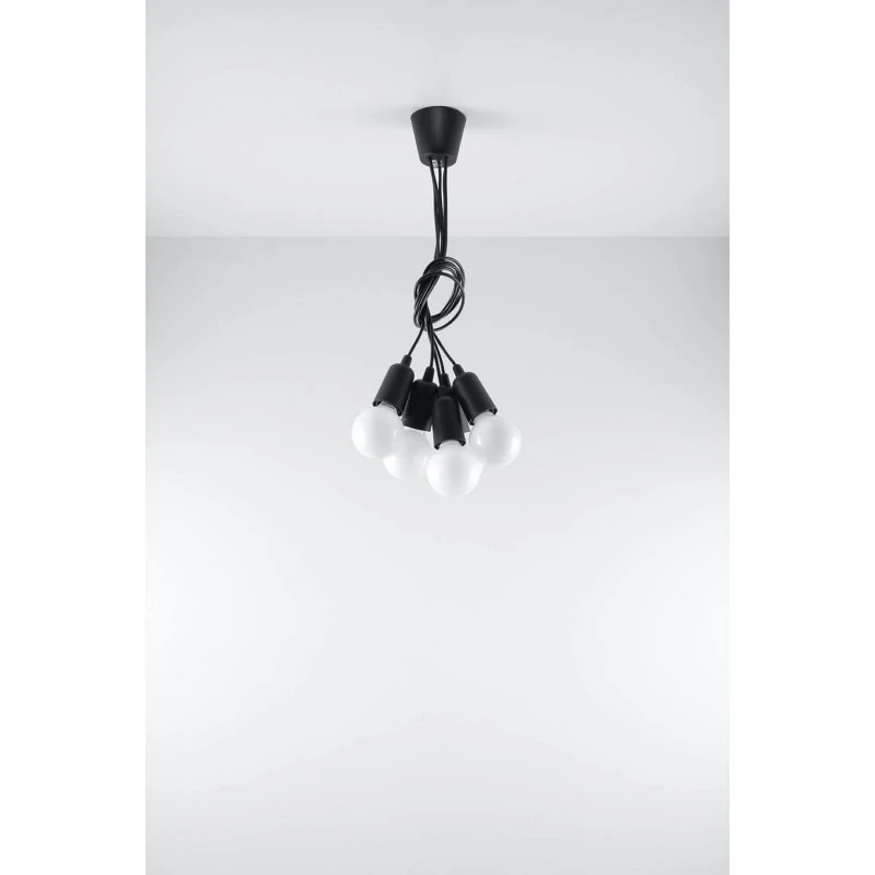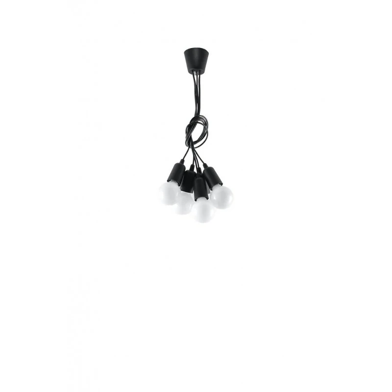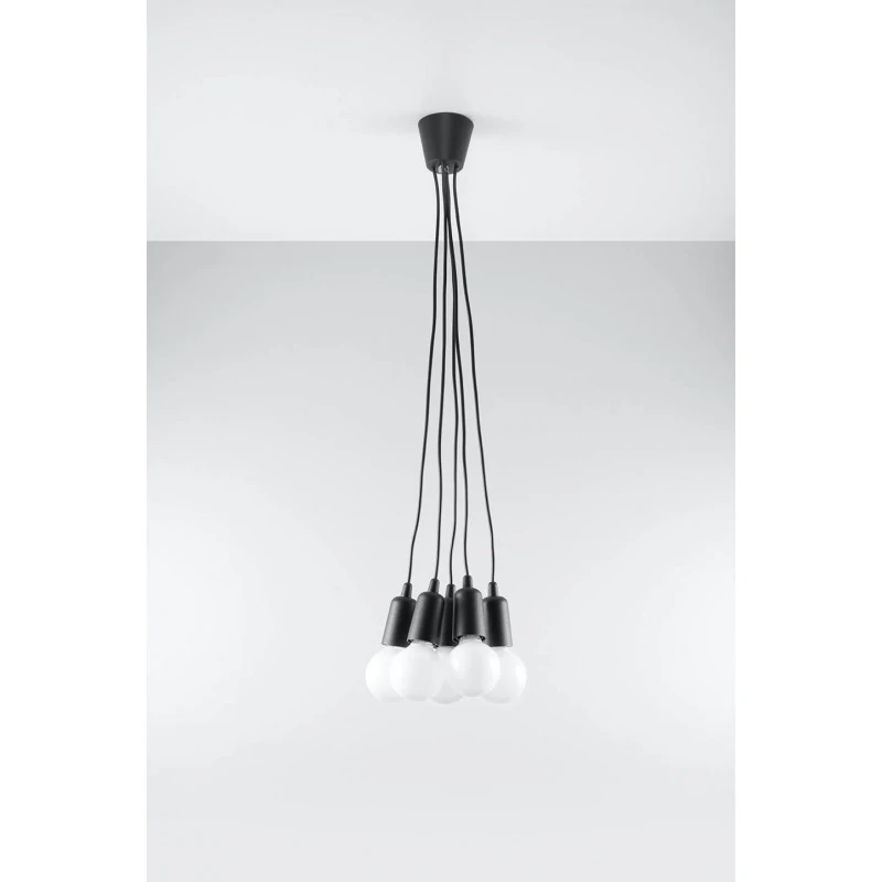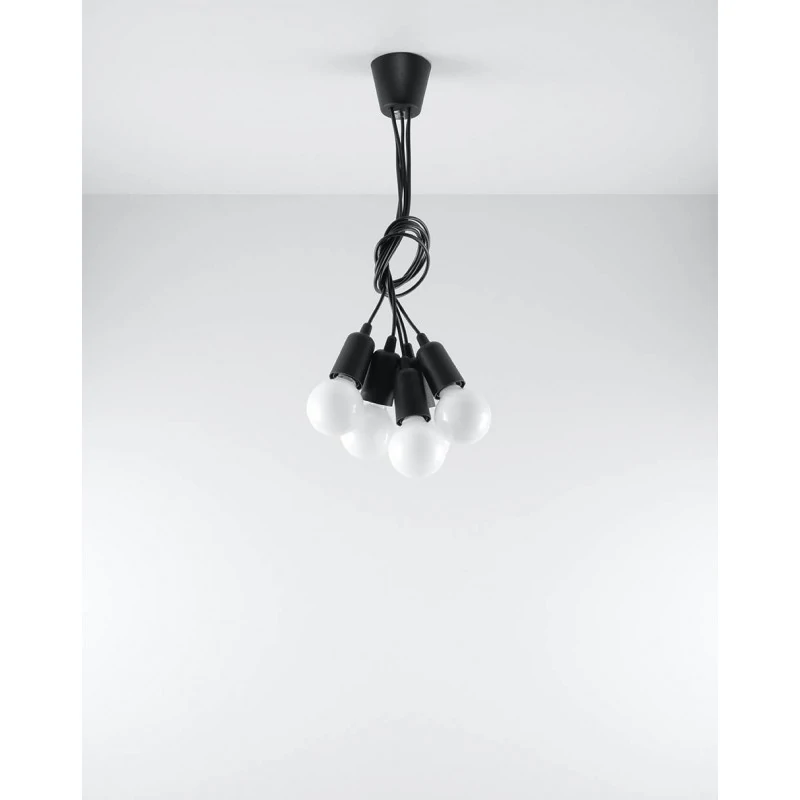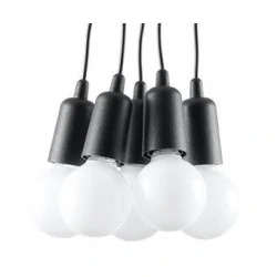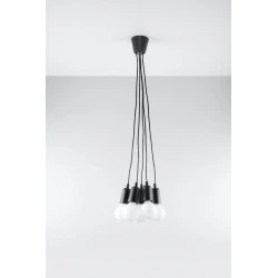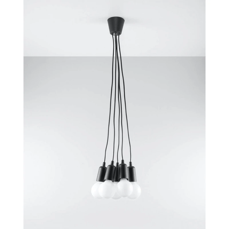Czarna lampa wisząca DIEGO 5 polskiego producenta SOLLUX to prosta oprawa oświetleniowa z tworzywa sztucznego przeznaczona na 5 żarówek E27 . Do oprawy pasują żarówki o mocy do 60W każda (15W LED). Brak źródła światła w zestawie. Maksymalna długość oprawy to 90 cm, a średnica podsufitki oprawy to 9cm. Model dostępy w wielu modnych kolorach. Piękna prostota opraw DIEGO to doskonałe oświetlenie pomieszczeń oraz minimalizm w najczystszej postaci. Produkt objęty gwarancją producenta.Model zwisu dostęny także w wersji na 1 lub 3 źródła światla. Lampy DIEGO przeznaczone są do użytku wewnątrz pomieszczeń.