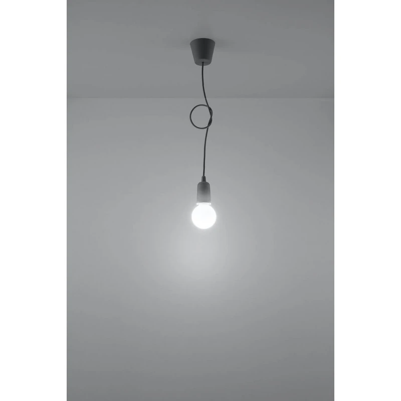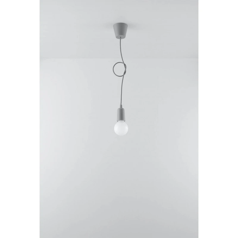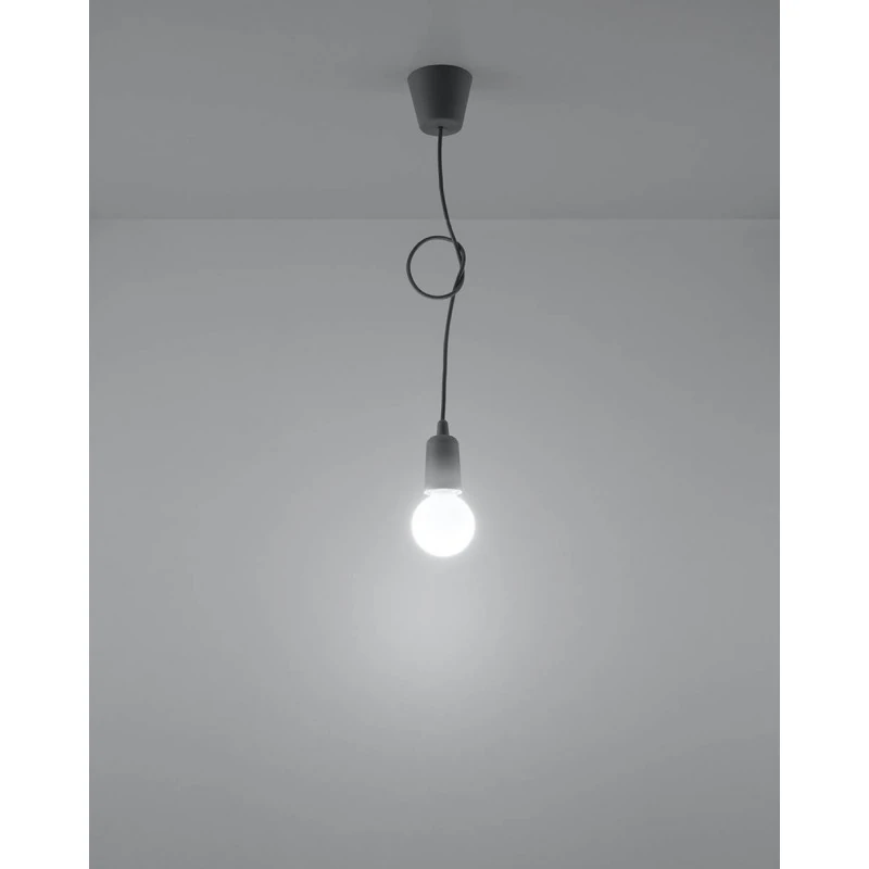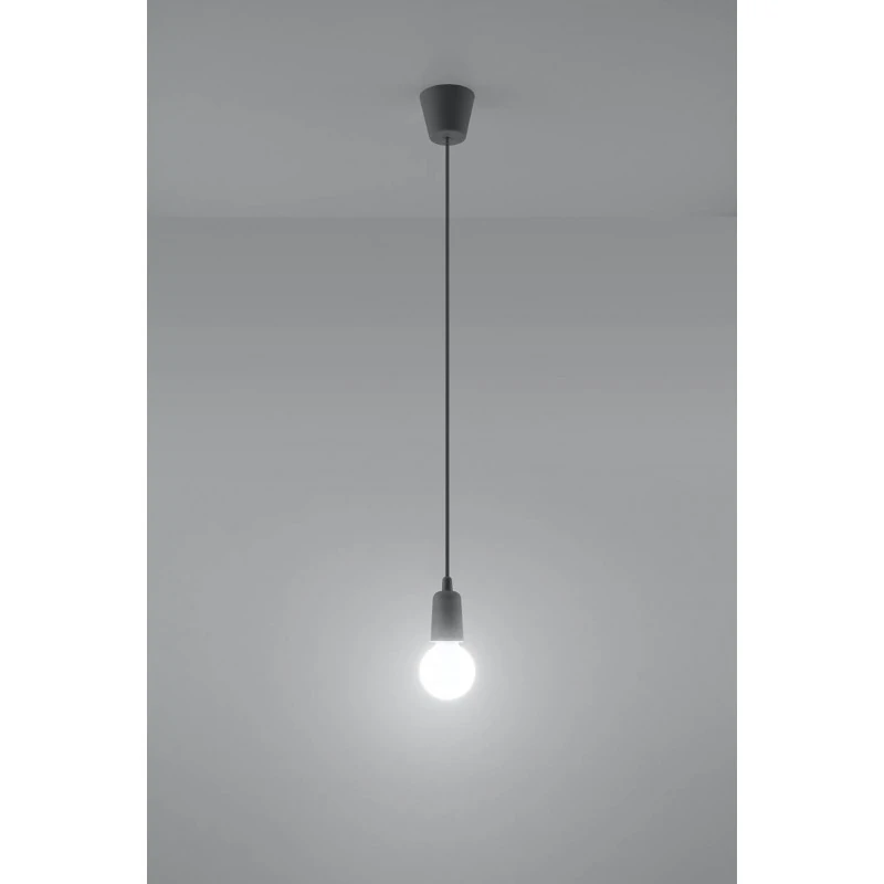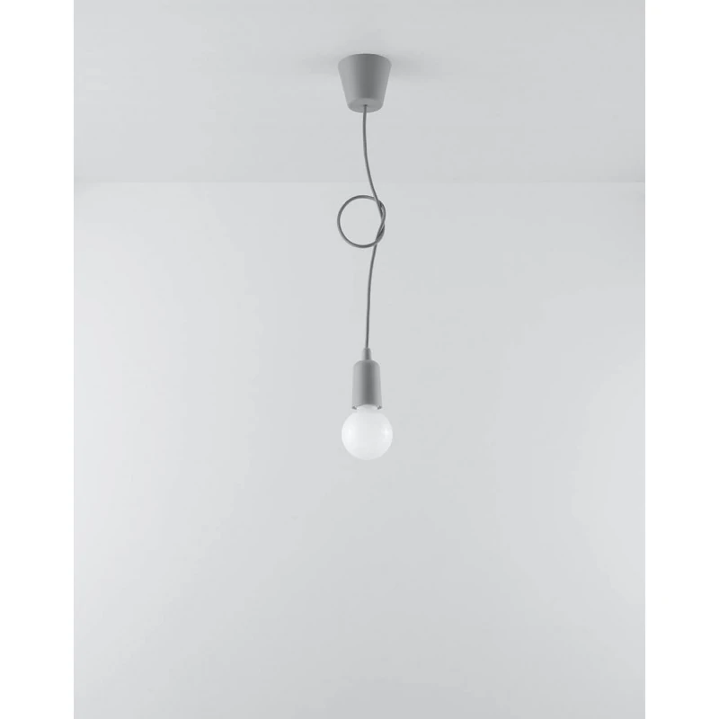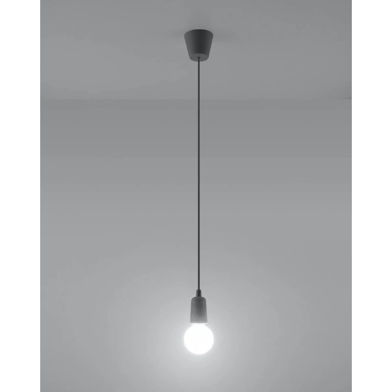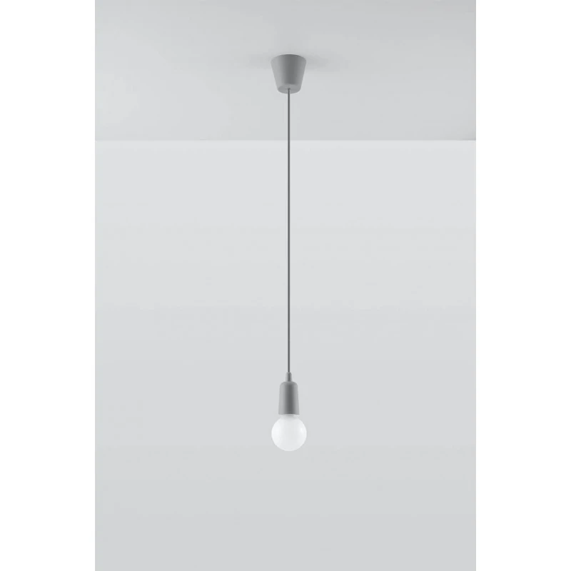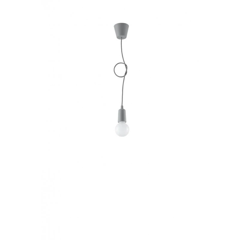 Szara lampa wisząca DIEGO polskiego producenta SOLLUX to prosta oprawa oświetleniowa z twrzywa sztucznego przeznaczona na żarówkę E27. Do oprawy pasują żarówki o mocy do 60W (15W LED). Brak źródła światła w zestawie. Maksymalna długość oprawy to 90 cm, a średnica podsufitki oprawy to 9cm. Model dostępy w wielu modnych kolorach. Piękna prostota opraw DIEGO to doskonałe oświetlenie pomieszczeń oraz minimalizm w najczystszej postaci. Produkt objęty gwarancją producenta. Produkt dostępny także w wersji na 3 punkty świetlne. Wymiary plastikowego klosza to 5x8cm.