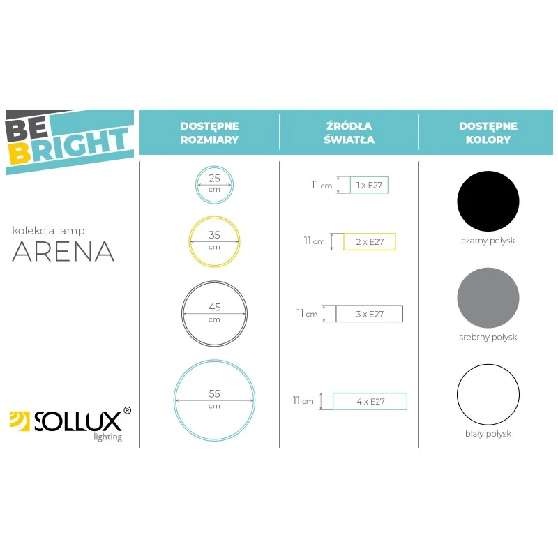 Biały plafon Arena marki Sollux lighting to prosta i funkjconalna forma w naszym oświetleniu. Lampa sufitowa, która stanie się wyjątkową ozdobą w salonie czy jadalni. Zawieszona pojedynczo czy jako kilka punktów świetnych o różnych rozmiarach będzie rozjaśniać wybraną przestrzeń. Dzięki wymiennym źródłom światła o gwincie E27 dobierzemy odpowiednią do naszych oczekiwań moc i barwę światła. Pamiętajmy, że żarówka nie została dołączona do zestawu. Oświetlenie sufitowe Arena dostępne jest w trzech wersjach kolorystycznych i w kilku rozmiarach. Plafon jest łatwy w utrzymaniu czystości. Polski produkt, który objęty jest 5-letnią gwarancją producenta.