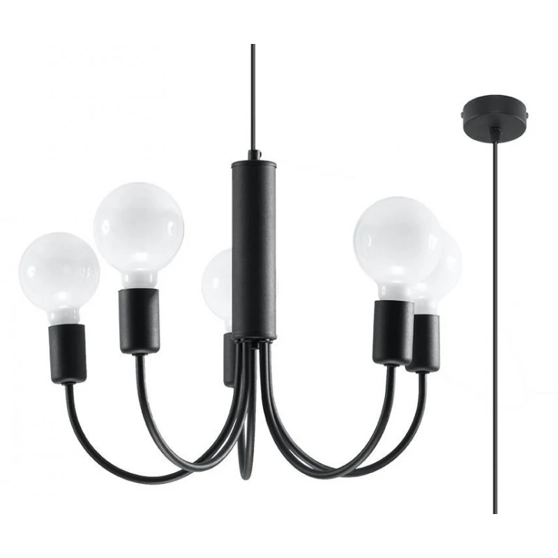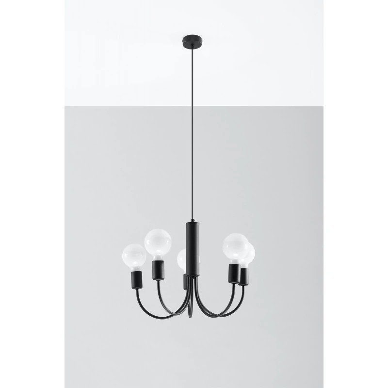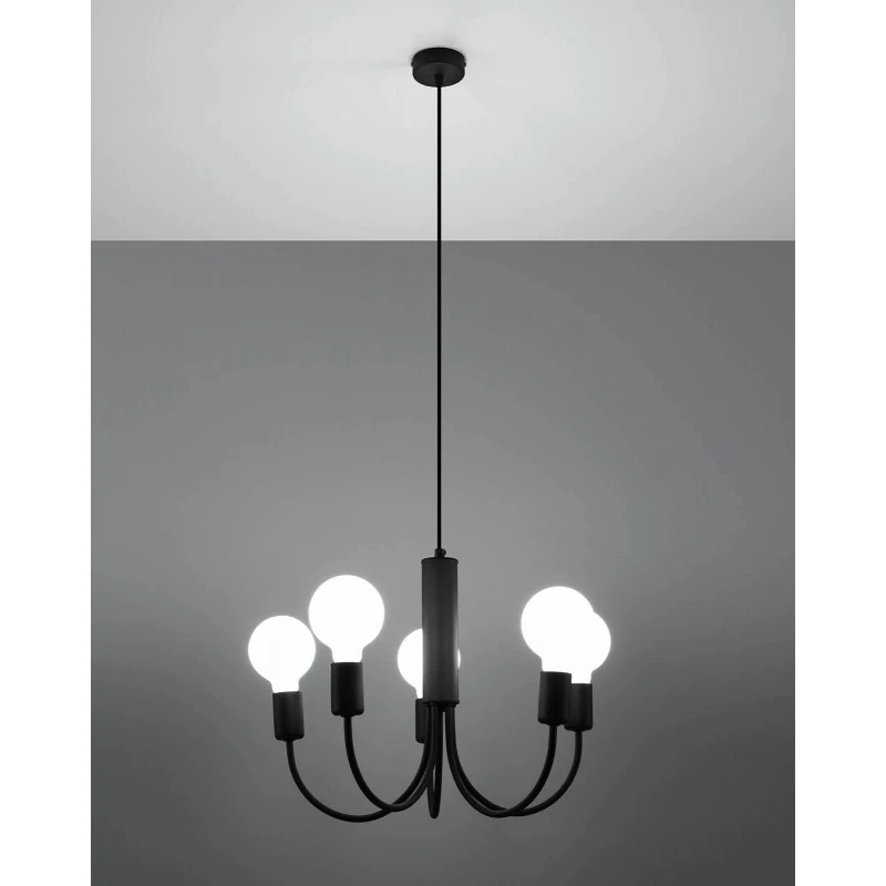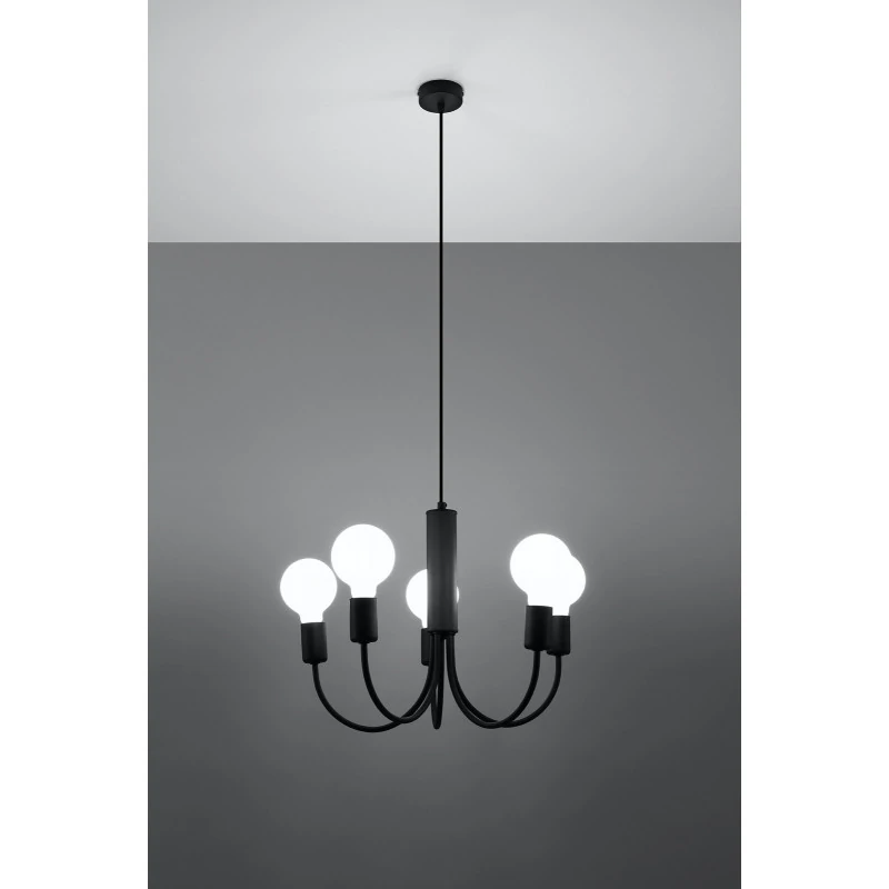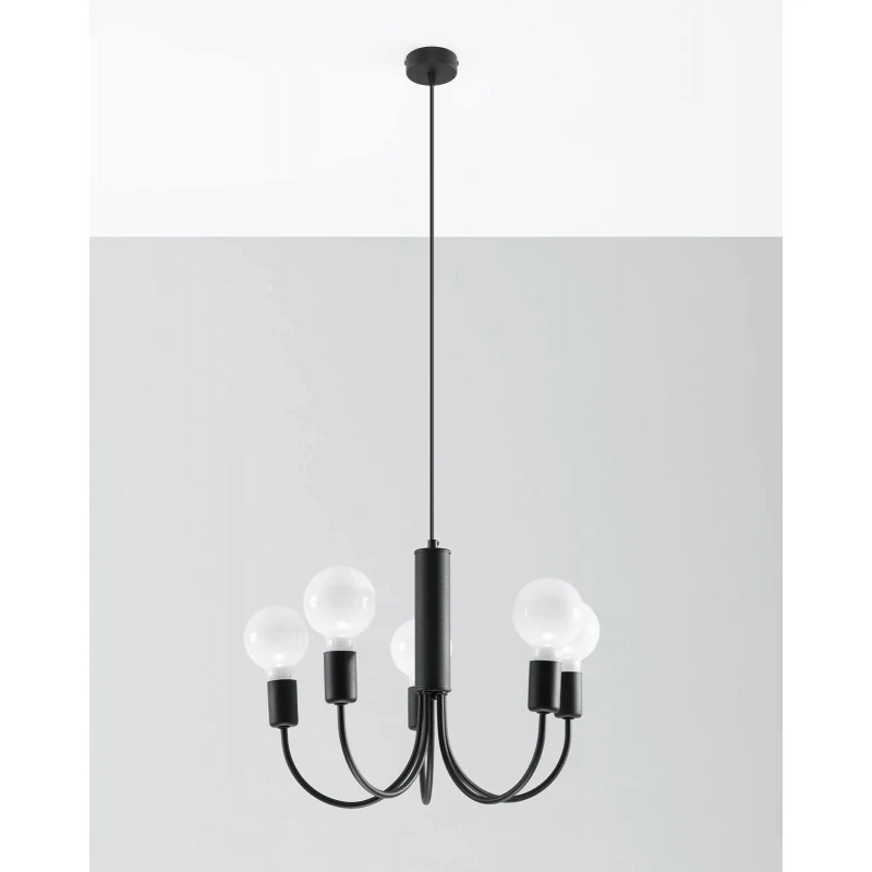 Czarny żyrandol Piccolo marki Sollux lighting to ciekawe i nowoczesne oświetlenie naszego salonu czy jadalni. Lampa sufitowa nie posiada klosza, więc światło doda blasku naszemu wnętrzu. Minimalistyczna i piękna ozdoba, która dostępna jest również w wersji z 3 punktami świetlnymi. Wymienne źródła światła o gwincie E27 sprawią, że dobierzemy do naszych oczekiwań odpowiednią moc i barwę światła. Pamiętajmy, że żarówki nie zostały dołączone do zestawu. Żyrandol wykonany został ze stali i jest łatwy w utrzymaniu czystości, bo wystarczy przetrzeć go szmatką. Polski produkt objęty 5-letnią gwarancją producenta.