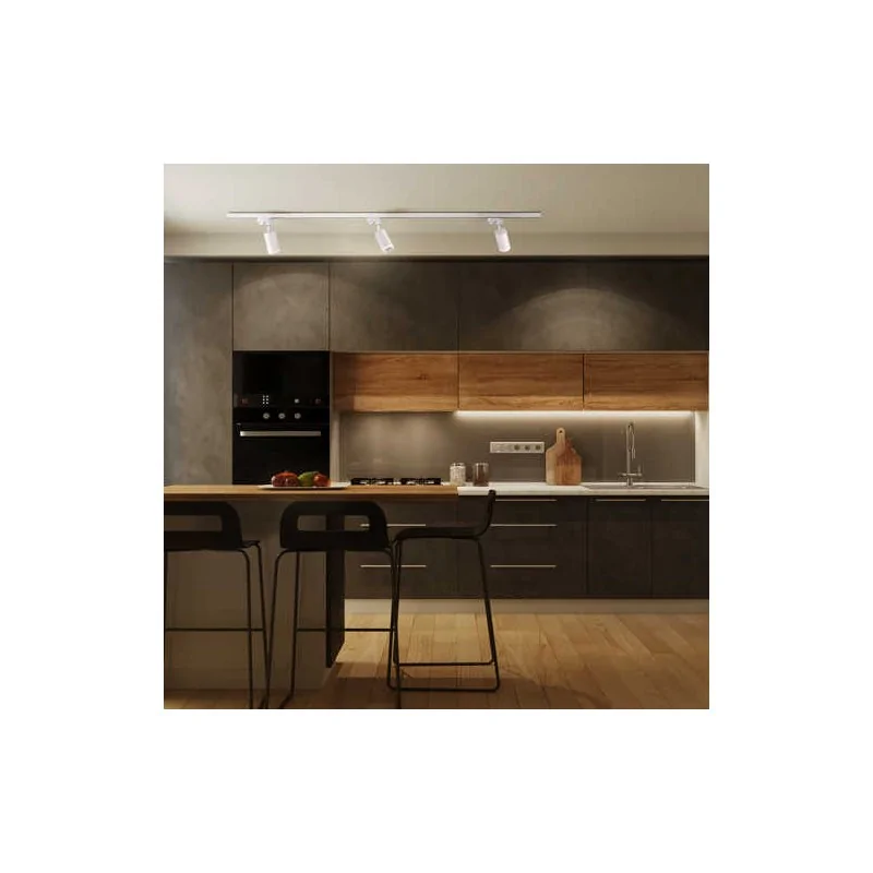 Zestaw lamp szynowych z 1-metrową szyną PARIS marki POLUX to nowoczesna forma oświetleniowa, która idealnie nada się do salonu czy kuchni. Biały uniwersalny kolor obudowy łatwo dopasuje się do każdego wnętrza. Lampa szynowa posiada trzy klosze w kształcie reflektorów na żarówki z gwintem GU10 o maksymalnej mocy 10W led (3xGU10). Brak źródła światła w zestawie pozwala na samodzielne dopasowanie mocy, barwy oraz natężenia światła do własnych potrzeb. Zestaw zawiera 3 reflektory oraz szynę o długości 1m.