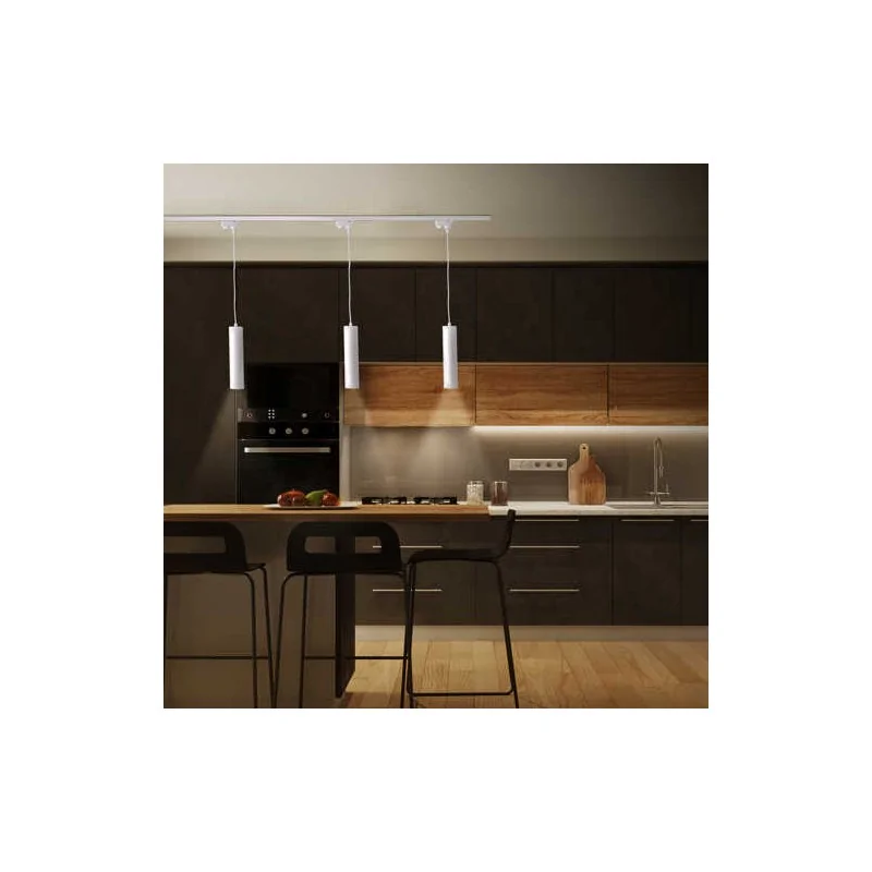 Zestaw oświetlenia szynowego MARIBEL marki POLUX wyposażony został w trzy oprawy wiszące GU10 z białym i złotym wymiennym pierścieniem dekoracyjnym oraz 1-metrową szynę. Produkt sprzedawany jest bez źródła światła w zestawie, co pozwala na samodzielne dobranie mocy, barwy i natężenia żarówki do własnych potrzeb. Oświetlenie szynowe przystosowane jest źródeł światła GU10 o maksymalnej mocy 10W led. Zestaw MARIBEL wykonany został głównie z wysokiej jakości aluminium, co gwarantuje długą żywotność produktu.
