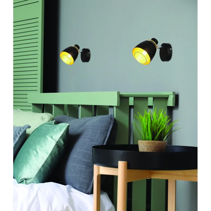 Materiał wykonania: podstawa stalowa, klosz stalowy. Kolor podstawy: czarny + złoty. Wysokość: 12. Szerokość: 16,5. Głębokość: 10. Wymiary (wys. x szer. x gł.): 12x16,5x10. Waga netto: 0,29. Rodzaj trzonka: E14.