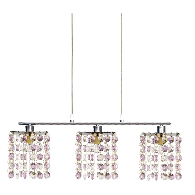 Materiał wykonania: klosz z podwieszonych kryształków, podstawa metalowa. Kolor podstawy: chromowy, kryształki fioletowe. Wysokość: 70. Szerokość: 52. Głębokość: 10. Wymiary (wys. x szer. x gł.): 70x52x10. Waga netto: 1,08. Rodzaj trzonka: G9.