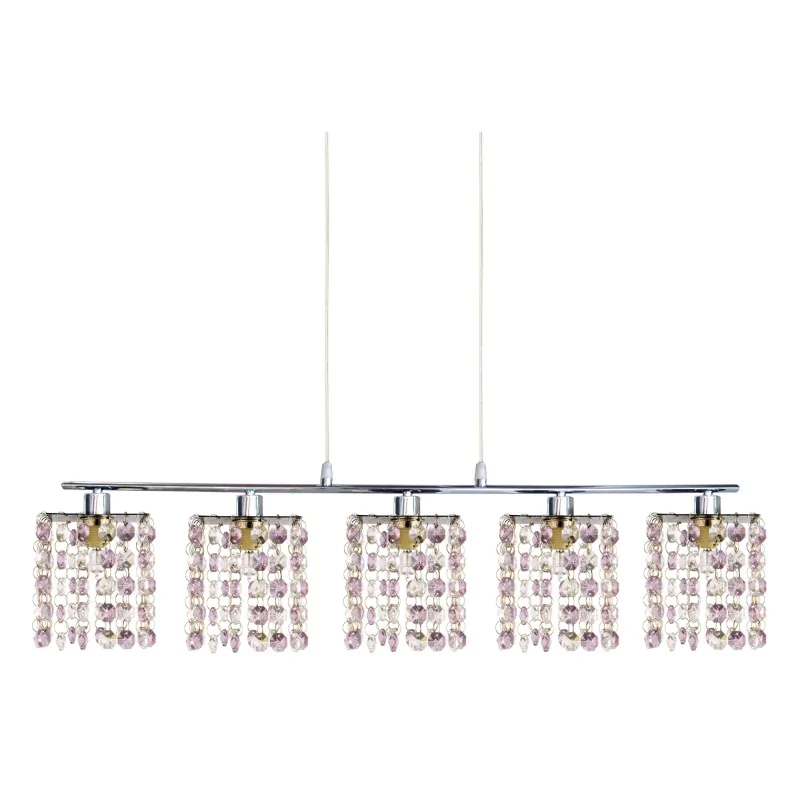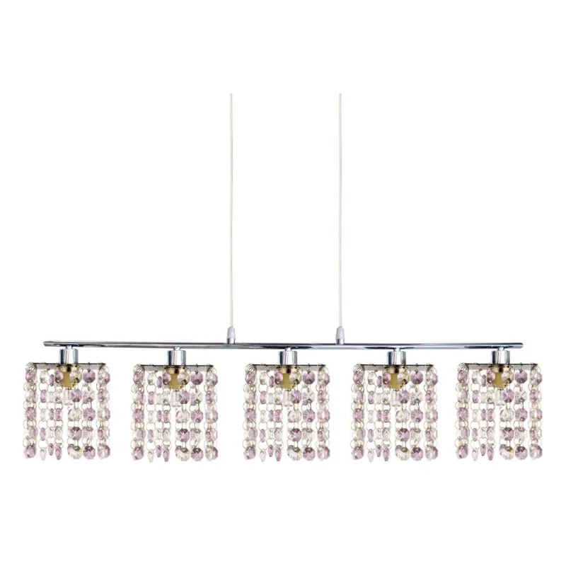Materiał wykonania: klosz z podwieszonych kryształków, podstawa metalowa. Kolor podstawy: chromowy, kryształki fioletowe. Wysokość: 80. Szerokość: 80. Głębokość: 10. Wymiary (wys. x szer. x gł.): 80x80x10. Waga netto: 1,71. Rodzaj trzonka: G9.