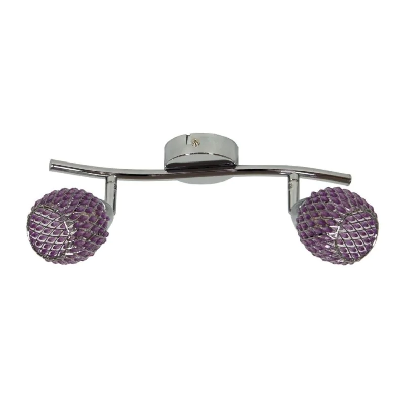 Materiał wykonania: klosz z podwieszonych kryształków, podstawa metalowa. Kolor podstawy: chromowy, kryształki fioletowe. Wysokość: 19. Szerokość: 39. Głębokość: 8. Wymiary (wys. x szer. x gł.): 19x39x8. Waga netto: 0,39. Rodzaj trzonka: G9.