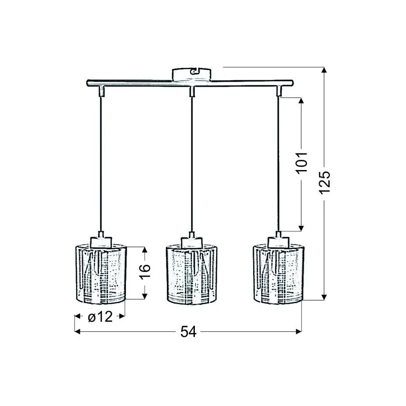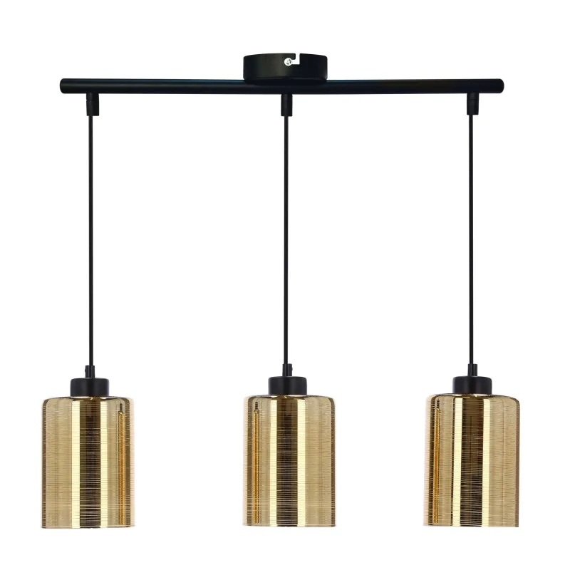 Materiał wykonania: klosz szklany, zawiesie metalowe, przewód w bawełnie. Kolor podstawy: czarno złoty. Wysokość: 125. Szerokość: 54. Głębokość: 12. Wymiary (wys. x szer. x gł.): 125x54x12. Waga netto: 1,60. Rodzaj trzonka: E27.