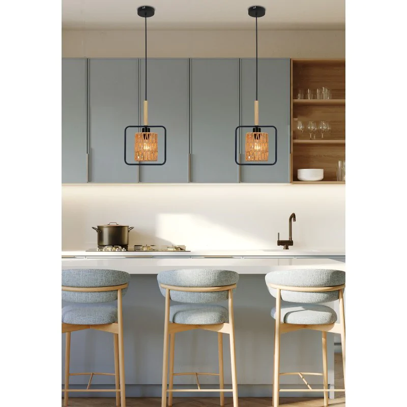 Materiał wykonania: zawiesie stalowe, drewno, abażur z plecionego sznurka. Kolor podstawy: czarny + beżowy. Wysokość: 110. Szerokość: 20. Głębokość: 12. Wymiary (wys. x szer. x gł.): 110x20x12. Waga netto: 0,56. Rodzaj trzonka: E27.