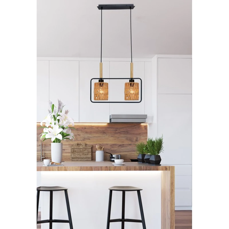 Materiał wykonania: zawiesie stalowe, drewno, abażur z plecionego sznurka. Kolor podstawy: czarny + beżowy. Wysokość: 110. Szerokość: 50. Głębokość: 12. Wymiary (wys. x szer. x gł.): 110x50x12. Waga netto: 1,28. Rodzaj trzonka: E27.