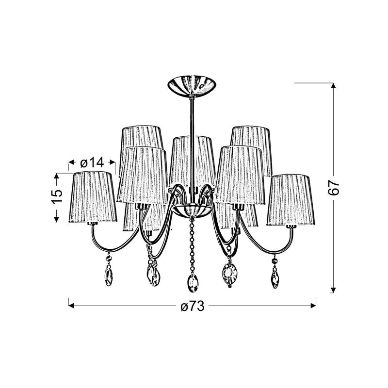 Materiał wykonania: podstawa stalowa, abażur z tasiemki z organzy. Kolor podstawy: chromowy, abażur czarny. Wysokość: 67. Szerokość: 73. Głębokość: 73. Wymiary (wys. x szer. x gł.): 67x73x73. Waga netto: 4,98. Rodzaj trzonka: E14.