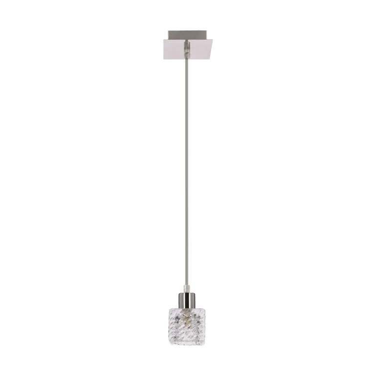 Materiał wykonania: klosz kryształ, linka metal. Kolor podstawy: chromowy + bezbarwny. Wysokość: 100. Szerokość: 10. Głębokość: 10. Wymiary (wys. x szer. x gł.): 100x10x10. Waga netto: 1,85. Rodzaj trzonka: G9.
